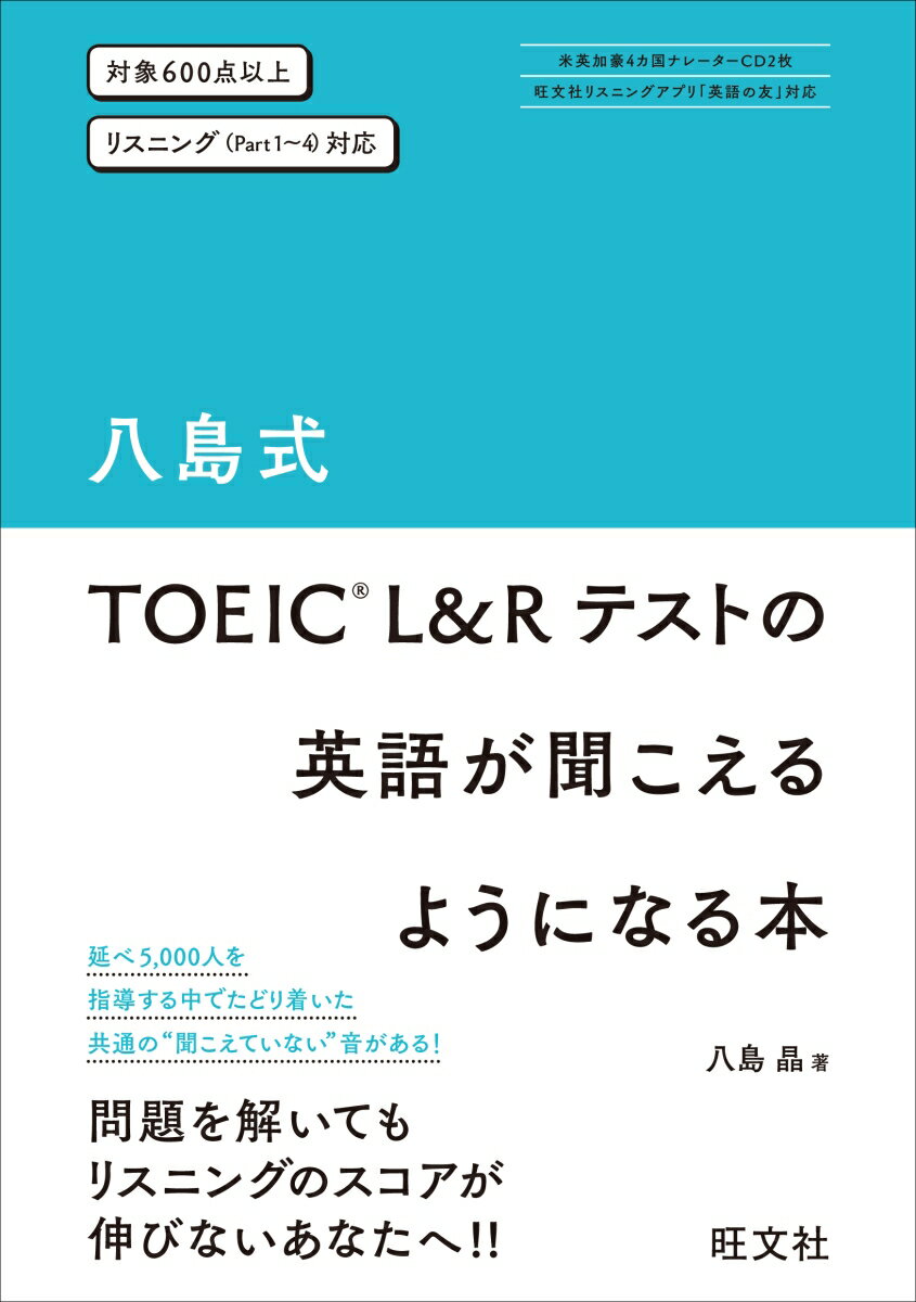 問題を解いても解いてもリスニングのスコアが伸びないあなたへ!TOEIC L&Rセミナーを開催する八島晶先生の、のべ5000人を指導した経験が詰まった1冊です。以下の流れで、「英語が聞こえるようになる」ことを目指します。●「英語の音を身に付ける」Part1、2を素材とし、それぞれが頭の中に持っている音と、実際にナレーターが話す音のギャップを知り、正しい英語の音を身に付けます。主な学習の流れ「問題を解く」⇒「穴あきディクテーションをする」⇒「問題の解説を読む」⇒「音の解説を読む」●「英語の語順を身に付ける」Part3、4では、語数が多く複雑な構文が登場します。こういった文を英語の語順のままに理解するために、音読を行います。主な学習の流れPart1、2と同じ流れの学習をした後、「語順の解説を読み、音読」そのほかの特長は、以下のとおりです。・CDには、ナチュラルスピードの音声のほか、低速・高速にした音声を収録。・さらに、旺文社リスニングアプリ「英語の友」を使えば好きな速さに変えてトレーニング可能! 詳しくは、公式ウェブサイト(https://eigonotomo.com/)をご覧ください。Part 1(写真描写問題) -英語の音を身に付ける(基礎)Part 1はこんな問題!Lesson 1 日本語と英語で異なる音Lesson 2 子音1子音の連続,語尾の子音Lesson 3 子音2l(エル)の音Lesson 4 子音3wの音,thの音Lesson 5 母音1オ/ア/エア,オウ/オーの音Lesson 6 母音2イ/エの音Lesson 7 練習問題 Part 2(応答問題) -英語の音を身に付ける(応用)Part 2はこんな問題!Lesson 1 音節の数が記憶と異なる単語Lesson 2 ストレスの位置が記憶と異なる単語Lesson 3 強く読む単語,弱く読む単語Lesson 4 つながる音Lesson 5 消える音Lesson 6 イギリス英語,オーストラリア英語Lesson 7 練習問題Part 3(会話問題) -英語の語順を身に付ける(基礎)Part 3はこんな問題!Lesson 1 店員と客の会話1Lesson 2 店員と客の会話2Lesson 3 同僚同士の会話1Lesson 4 同僚同士の会話2Lesson 5 練習問題Part 4(説明文問題)-英語の語順を身に付ける(応用)Part 4はこんな問題!Lesson 1 留守番電話Lesson 2 スピーチLesson 3 アナウンスLesson 4 ラジオLesson 5 練習問題