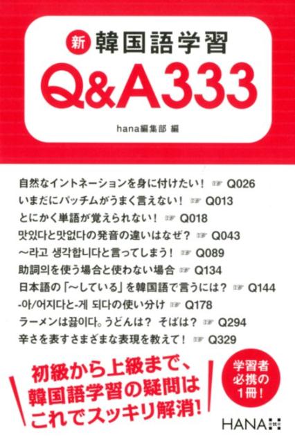 韓国語学習者と教師たちの参考書として好評を博した『韓国語学習Q&A200』(アルク刊)が、ボリュームアップして新登場! 前作に収録した内容に、『韓国語学習ジャーナルhana』の連載記事「韓国語学習Q&A」と特集で扱った質問と回答を加え、全333の項目を収録しました。「どうしてこの発音になるのか?」「二つの語尾をどう使い分けるのか?」など、韓国語学習者が抱く、こうしたさまざまな疑問にお答えします。