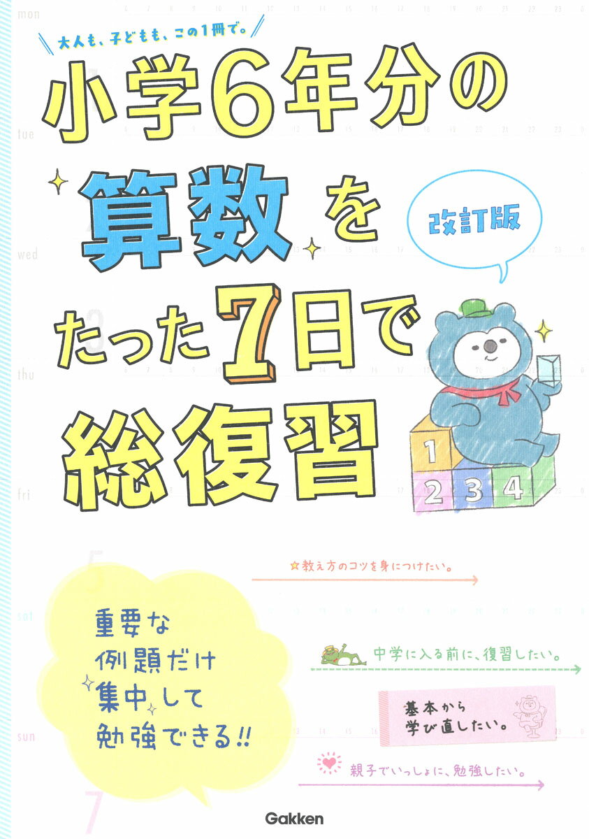 小学6年分の算数の重要な例題を厳選! 1週間で、一生使える算数力が身につきます。イラストも豊富に使った説明で、学校の解き方で学べるから、算数が苦手でも大丈夫。中学入学前に一気に復習するとき、親が子どもに教えるとき、大人の学び直しにも役立ちます。人気シリーズの改訂版。< 1日目 数のしくみ > 数の表し方 / 倍数・約数 / 概数 / 数のしくみの練習問題 < 2日目 整数・小数の計算 > 整数の計算 / 計算のきまり / 小数のたし算・ひき算 / 小数のかけ算 / 小数のわり算 / 整数・小数の計算の練習問題 < 3日目 分数の計算 > 分数のしくみ / 分数のたし算・ひき算 / 分数のかけ算・わり算 / 分数の計算の練習問題 < 4日目 平面図形 > 平面図形の性質 / 角の大きさ / 四角形・三角形の面積 / 円 / 合同,対称,拡大図と縮図 / 平面図形の練習問題 < 5日目 立体図形 > 立体図形の性質 / 体積・容積 / 量の単位 / 立体図形の練習問題 < 6日目 数量関係1 > 平均 / 単位量あたりの大きさ / 速さ / 割合 / いろいろなグラフ / 数量関係1の練習問題 < 7日目 数量関係2 > 比 / 比例と反比例 / 場合の数 / 資料の整理 / 数量関係2の練習問題