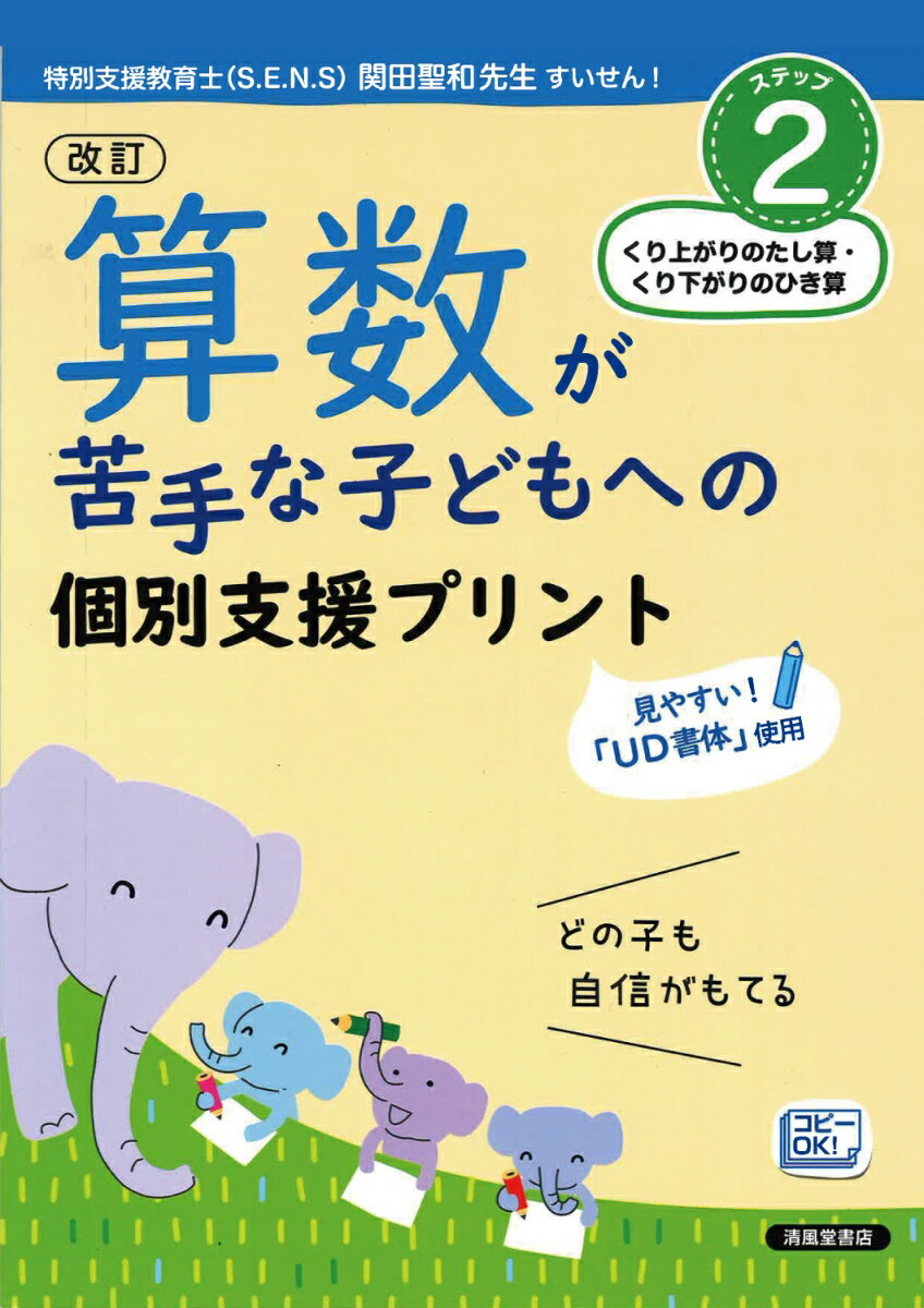 特別支援教育士(S.E.N.S) 推薦!!「算数が苦手」「個別に支援が必要」そんな子どもたちのためのプリントです。ステップ2は、「くり上がりのたし算、くり下がりのひき算、 大きな数、数えること」(小学1年 後半)プリントの4つの特長1 読みやすいUD書体 どの子にも、見やすいといわれる「UD書体」を取り入れました。 UD書体は、2020年からの教科書でも使われています。2 学習しやすい内容 はじめての問題にはていねいな説明を入れました。 スモールステップですすめられる問題配列にしました。3 安心して取り組める問題量 問題の量をおさえ、どの子も安心して取り組めるようにしました。 「やりきった」という達成感があるから、継続して取り組めます。4 算数の基礎基本「四則演算」に特化 算数の基礎基本「たす・ひく・かける・わる」がマスターできる内容に特化しました。 どの子も「できた」「たのしい」と感じてもらえるようにつくりました。特別支援教育士(S.E.N.S) 関田聖和先生 推薦のプリントです。
