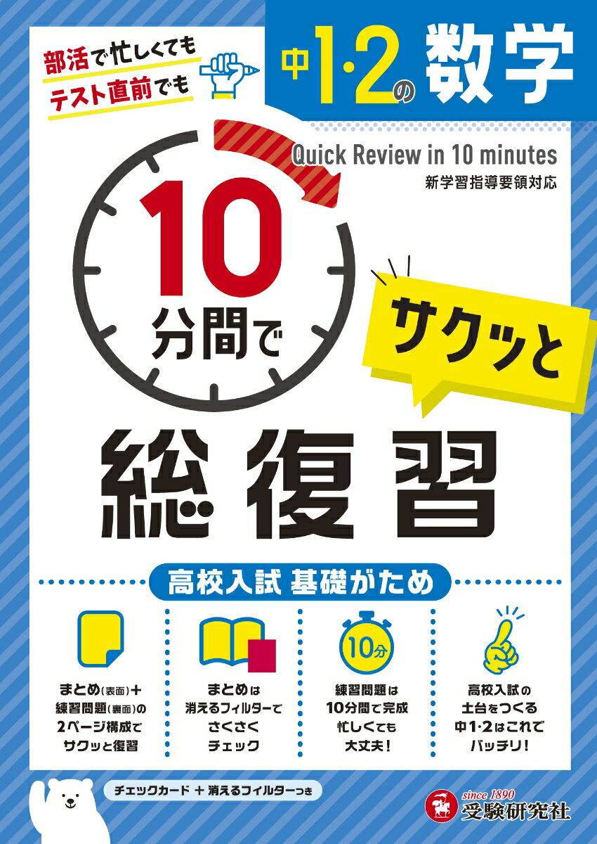○まとめページ+問題で1単元構成まとめページでは重要事項や問題の解き方を,問題ページではまとめページに対応した練習問題を掲載しています。目標時間10分で,部活で忙しくても,テストの直前でも,サクッと復習できます。○ 「消えるフィルター」でポイントチェックまとめページの重要ポイントは赤刷りにしてあるので,「消えるフィルター」を使って覚えるまで何度でもチェックできます。○ 高校入試問題にチャレンジ!巻末の「中学1・2年の総復習テスト」には,実際に出題された高校入試問題をのせているので,身につけた力を試すことができます。○ チェックカード(巻末付録)切り離して持ち運べる便利なチェックカード(8ページ)がついています。