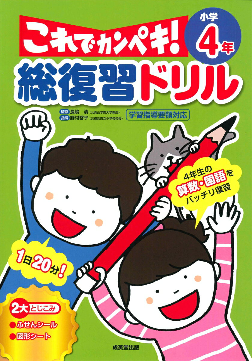 このドリルは、1つの単元を20分程度で学習することができます。毎日1単元ずつ問題を解くことで、効率よく4年生の復習ができ、苦手な単元を克服しておけば、自信をもって5年生に進むことができます。三角形、四角形、円の平面図形や、立体図形をまとめた「図形シート」と、「ふせんシール」つき。別冊の解答には、重要な注意点やくわしいアドバイスを掲載。学習指導要領対応。<算数> ● 大きな数 ● 折れ線グラフと表 ● わり算(1) ● 角 ● 四角形 ● わり算(2) ● がい数(およその数) ● 小数のしくみとたし算・ひき算 ● 計算のきまり ● 整理のしかた / 変わり方 ● 小数のかけ算 ● 小数のわり算 ● 面積 ● 直方体と立方体 ● 分数 ● まとめ<国語> ● 漢字の組み立て ● 漢字の読みとり(1) ● 漢字辞典の使い方 ● 熟語 ● 漢字の読み書き ● ことわざ ● 指ししめす言葉 ● 詩の読みとり ● 慣用句 ● つなぎ言葉 ● 説明文の読みとり ● 同じ読み方の漢字 ● 送りがな ● 物語の読みとり(2) ● 都道府県の漢字【別冊】 解答とアドバイス