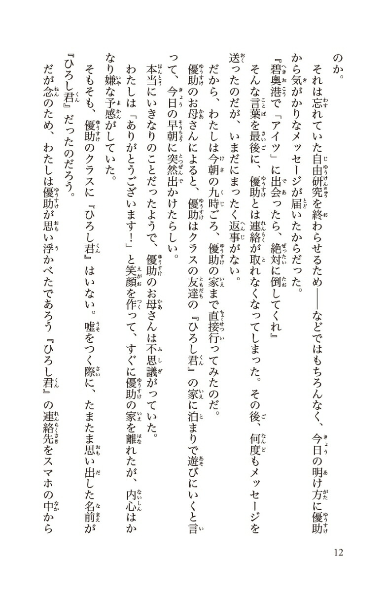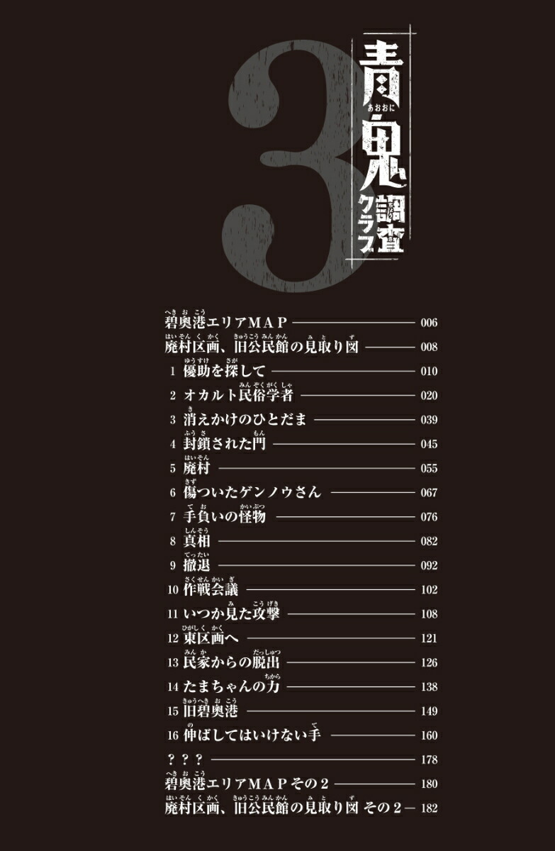 『青鬼 ドクロ島から脱出せよ!』(PHPジュニアノベル)の直前に起きた、恐ろしい失踪事件が軸になる、スピンオフストーリー!ジェイルハウスに続き、北部小学校でも怪物を倒すことに成功したレイカと優助、そしてスズナ。ところが優助は「碧奧港には近づくな」というメッセージをレイカに送信したあと、完全に姿を消してしまう。優助を探すため、碧奧港にやってきたレイカたちは衝撃の光景を目にする……!消えた幼なじみ、突如現れた2体の青鬼ーー「そう、あれは●●が青鬼になった姿よ」【目次】1 優助を探して/2 オカルト民俗学者/3 消えかけのひとだま/4 封鎖された門/5 廃村/6 傷ついたゲンノウさん/7 手負いの怪物/8 真相/9 撤退/10 作戦会議/11 いつか見た攻撃/12 東区画へ/13 民家からの脱出/14 たまちゃんの力/15 旧碧奧港/16 伸ばしてはいけない手/???