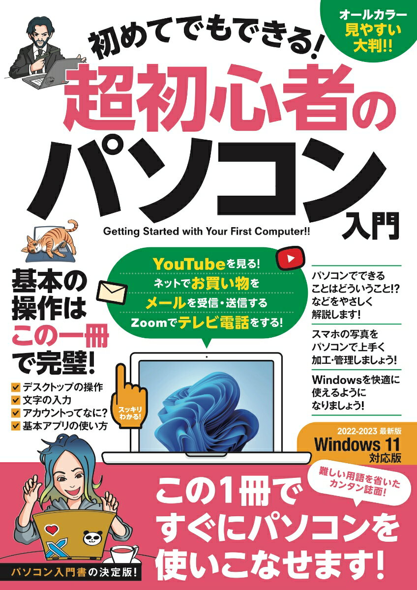 これからパソコンを使ってみたい人、最近使い始めた人に最適のパソコン入門書です。Windows 11対応版です。パソコンの電源の入れ方や、キーボードを使っての文字入力、インターネットへの接続方法、基本的なアプリの使い方など、初心者がつまずきそうな部分に重きをおいて、丁寧に解説しています。YouTubeでの動画の楽しみ方や、アマゾンでのお買い物、また今ではすっかりおなじみとなったテレビ電話など、ネットを使ったサービスの楽しみ方にも大きくページを割いています。本は大判(A4正寸版)で、通常のパソコン解説書より大きく、見やすい誌面になっています。初心者向けのパソコン解説書は「大きい文字」だけがセールスポイントで、内容の薄い本も一部存在しておりますが、本書は中身がぎっしりと詰まっており、読んでいただければ、かなり実用的にパソコンを使えるようになれる1冊です。11 第一章 パソコンの超基本25 第二章 パソコンの基本操作をマスターする53 第三章 標準アプリを使いこなす75 第四章 ネットのサービスを楽しもう85 第五章 さらに便利なテクニック