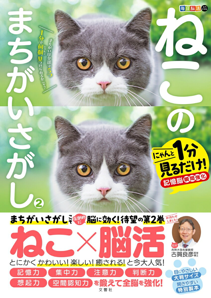 待望の第2巻!にゃんと1分見るだけ!「脳の刺激が足りない」「ついぼんやりしがち」「物忘れが増えた」「集中が続かない」そんな方にこの1冊!「まちがいさがし」は単なる子供の遊びではありません!「脳の4つの領域」をフルに使い記憶・集中・注意・判断・想起・空間認知など衰えやすい「6大脳力」を一斉強化できる高度な脳トレでした!そんな「まちがいさがし」に、かわいさを極めた「ねこの写真」で、記憶脳を瞬間強化できる「新感覚の脳トレ」が登場!制限時間は1分! 5つのまちがいのうち、いくつ見つけられますか?まちがいを見つけた瞬間、脳がひらめく!かわいいしぐさに胸がときめく!トリッキーな間違いであなたを悩ます良問・難問が全60問!目にやさしい大判サイズと開きやすい特別製本ぜひ一度ご体験ください。