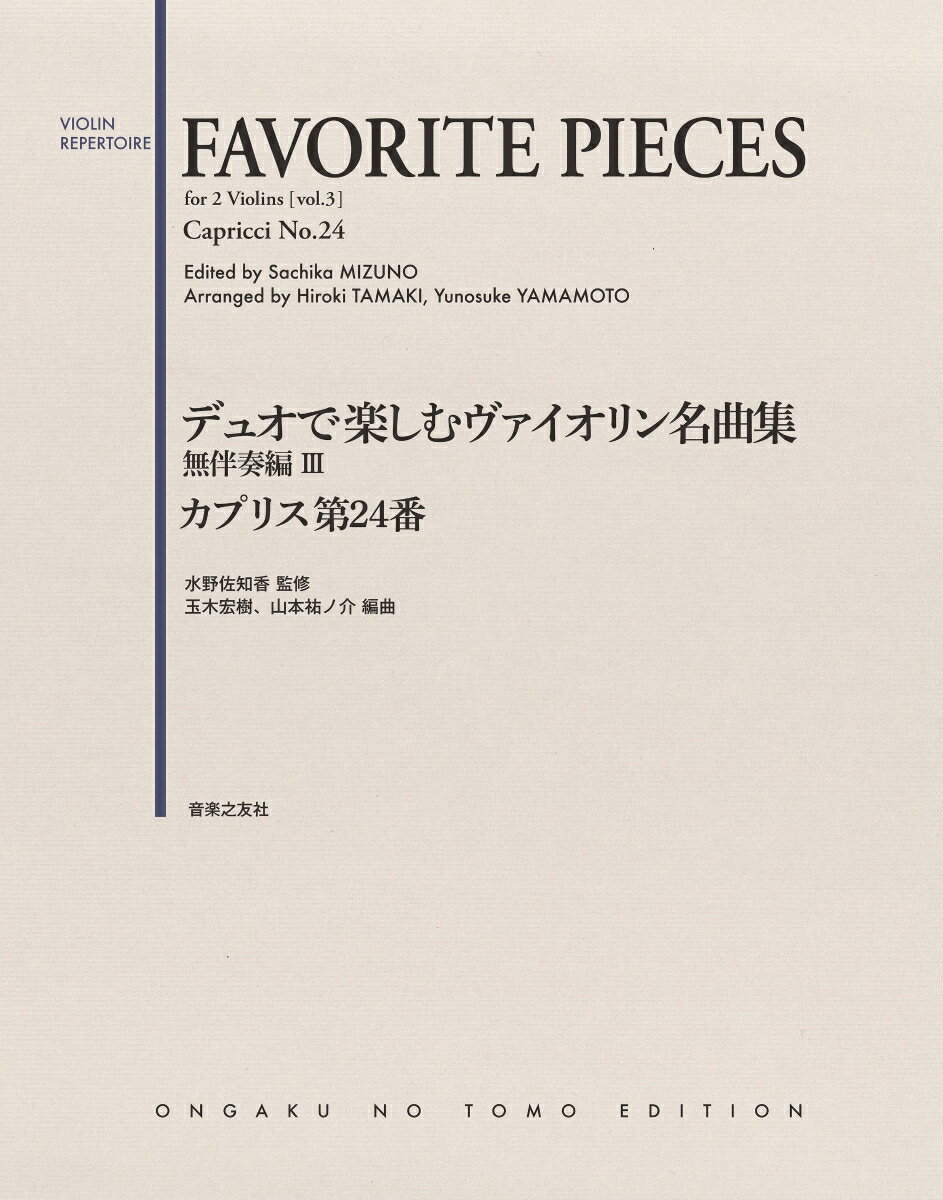 ヴァイオリン・アンサンブルにより原曲とまた違った魅力が引き出せる作品21曲を収録。後半はモーツァルトの名曲の数々を並べた。1.シシリアーノ2.グリーンスリーヴス3.ユモレスク4.猫ふんじゃった5.さくらさくら変奏曲6.スコットランドの釣鐘草7.タンゴのように8.二人のフィドラー9.歌劇「ウィリアム=テル」序曲10.プレリュード(バッハ)11.ガヴォット(バッハ)12.カプリス第24番〜モーツァルト名曲集〜13.モーツァルトの子守歌14.アダージョ15.トルコ行進曲16.ロマンツェ17.ロンド18.恋とはどんなものかしら19.アレグロ・ヴィヴァーチェ20.モルト・アレグロ21.ロンド・アレグレット
