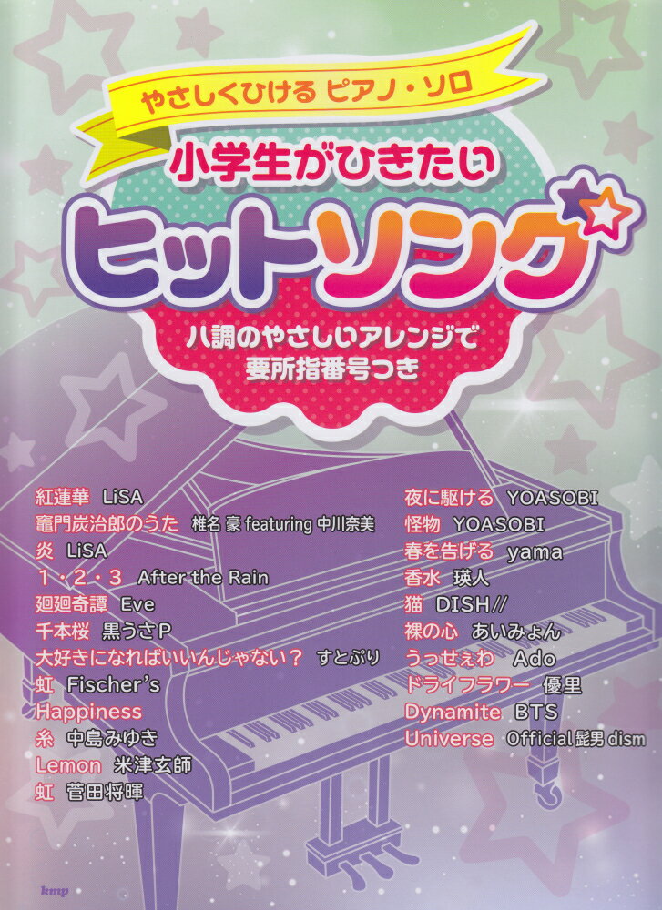 1:■指番号と手のかたち 2:■鍵盤と五線譜・楽譜の読み方 3:■音符と休符の長さ・音の大きさをあらわす記号 4:■この本に出てくる主な記号など・くり返し記号と演奏順 5:<曲目> 6:紅蓮華 7:竈門炭治郎のうた 8:炎 9:123(1・2・3) 10:廻廻奇譚 11:千本桜 12:大好きになればいいんじゃない? 13:虹 14:Happiness 15:糸 16:Lemon 17:虹 18:夜に駆ける 19:怪物 20:春を告げる 21:香水 22:猫 23:裸の心 24:うっせぇわ 25:ドライフラワー 26:Dynamite 27:Universe