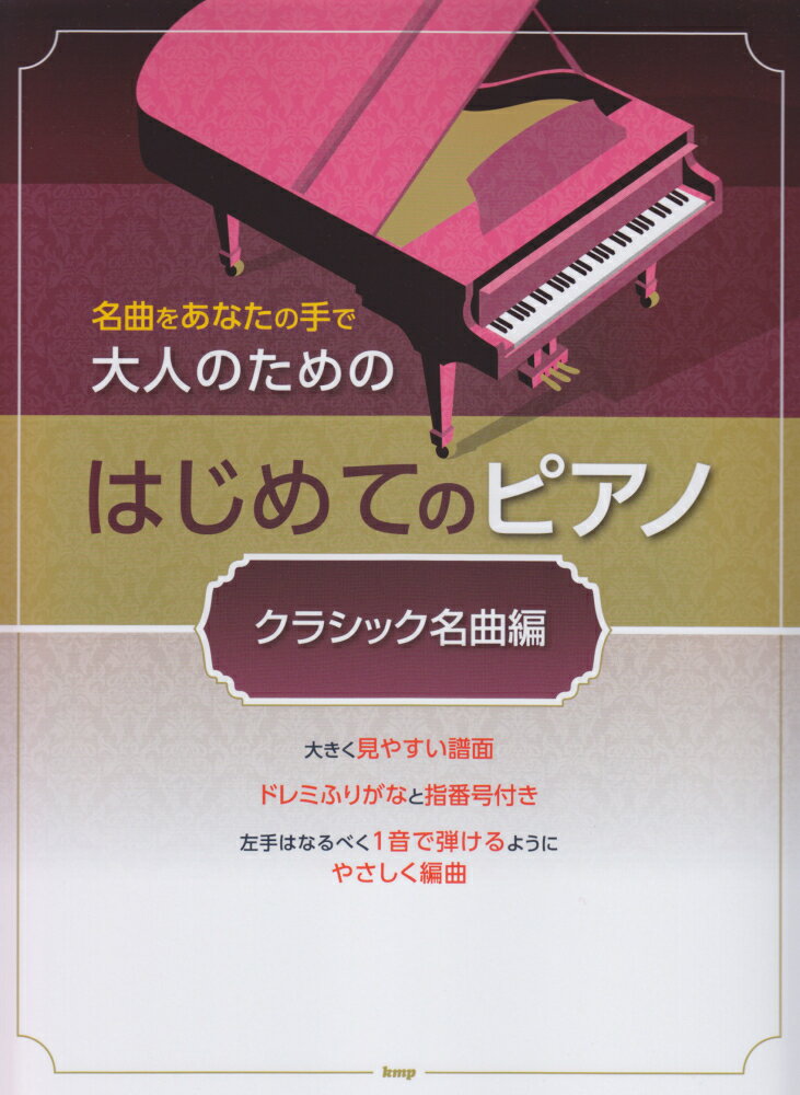 1:■指番号と手のかたち 2:■鍵盤と五線譜・楽譜の読み方 3:■音符と休符の長さ・音の大きさをあらわす記号 4:■この本に出てくる主な記号など・くり返し記号と演奏順 5:◆【曲集】・・・・・・・・・・・・・・・・・・・・・・・・・・・・・・・・・・・・・ 6:主よ人の望みの喜びよ 7:G線上のアリア 8:春 第1楽章 (ヴァイオリン協奏曲「四季」より) 9:ラデツキー行進曲 10:美しく青きドナウ 11:メヌエット BWV Anh.114 12:見よ、勇者は帰る 13:ワルキューレの騎行 14:パッヘルベルのカノン 15:ピアノソナタ第11番第1楽章 16:ツァラトゥストラはかく語りき 17:きらきら星変奏曲 18:トルコ行進曲 19:エリーゼのために 20:ピアノソナタ第14番「月光」第1楽章 21:交響曲第5番「運命」第1楽章 22:よろこびの歌 23:ト調のメヌエット 24:ピアノソナタ第8番「悲愴」第2楽章 25:トルコ行進曲 26:ラカンパネラ 27:愛の夢第3番 28:アメイジンググレイス 29:ノクターン第2番 30:別れの曲 31:華麗なる大円舞曲 32:前奏曲第7番 33:バラード第1番 34:ロンドンデリーの歌 35:組曲『惑星』より〜「木星」 36:ブラームスの子守唄 37:茶色の小瓶 38:シューベルトの子守唄 39:シューベルトのアヴェマリア 40:交響曲第9番「新世界より」第2楽章 41:ボレロ 42:ユーモレスク 43:トロイメライ 44:結婚行進曲 45:くるみ割り人形より〜「花のワルツ」 46:弦楽セレナーデ 47:モルダウ 48:愛のあいさつ 49:行進曲「威風堂々」第1番 50:亡き王女のためのパヴァーヌ 51:夢 52:ジュトゥヴ 53:ジムノペディ第1番 54:闘牛士の歌 55:乙女の祈り 56:人形の夢と目覚め 57:ペールギュント第1組曲より〜「朝」 58:展覧会の絵 59:栄冠は君に輝く (全国高等学校野球選手権大会の歌)