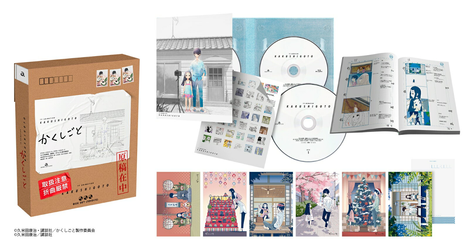 久米田康治による愛と笑い、ちょっと感動の漫画家パパ×娘物語「かくしごと」のTVアニメ全12話を収録したBlu-ray&DVD BOXの発売が決定!久米田康治による愛と笑い、ちょっと感動の漫画家パパ×娘物語「かくしごと」のTVアニメ全12話を収録したBlu-ray&DVD BOXがお求めやすい価格で発売!・「さよなら絶望先生」で人気を博した「久米田康治」原作作品!・「神谷浩史」「高橋李依」「花江夏樹」ほか、実力派声優陣が揃う!<収録内容>【Disc】:Blu-ray3枚組・本編第1話〜第12話 ▽特典映像・ノンクレジット・オープニング&エンディング・TVシリーズティザーPV&本PV※収録内容は変更となる場合がございます。