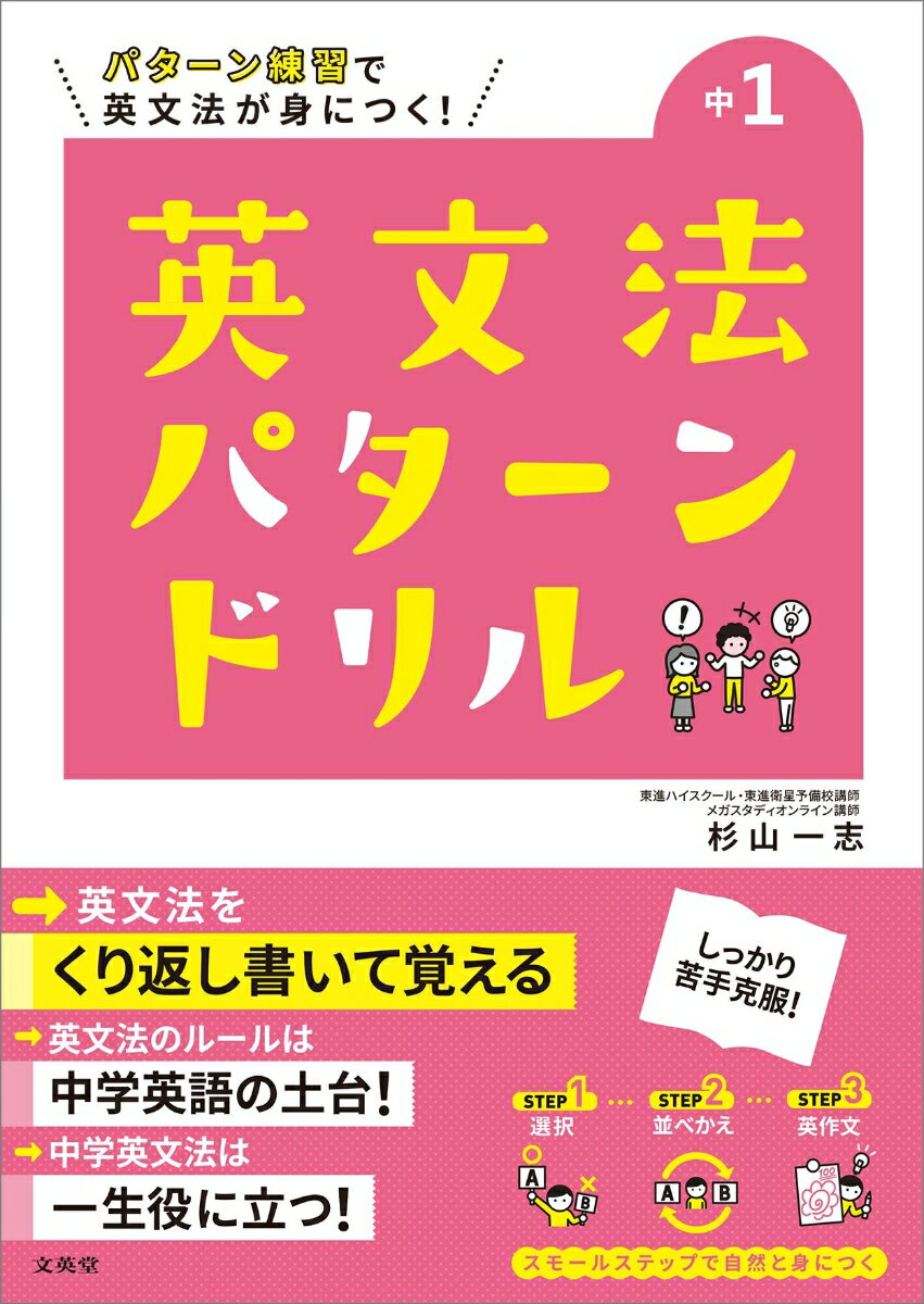 「パターン練習」で英文法が身につく!英文法はくり返し書いて覚える!※※本書の構成は、[本冊 144頁]+取り外して使える[別冊解答 24頁] となります。※※特長1 くり返し書いて覚える!Q1:選択問題 → Q2:並べかえ問題 → Q3:英作文問題 とくり返し練習しているうちに、英文法が自然と身につきます。特長2 スモールステップで基礎をしっかり定着!中学1年で習う英文法を64セクションに細かくわけているので、基礎からじっくり取り組めます。特長3 1セクション2ページ構成で手軽にサクサクできる!1セクション=2ページ、1回30分なので、英語が苦手でも無理なく取り組めます。