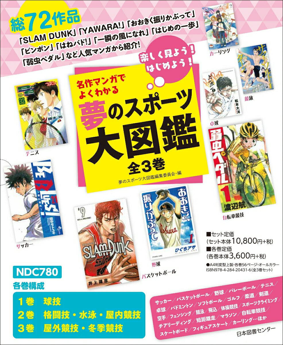 この本の特色1 競技スポーツ36種目について、名作マンガ総72点で楽しく紹介!マンガ作品の中から「このシーンが熱い!」「スゴワザ」場面をとりあげて解説。躍動感あふれるシーンで各競技の魅力を伝えます。2 1競技4ページ構成で、基本情報のほか、写真・イラスト・コラムなど豊富な内容!各スポーツの基本情報やルールをイラストや写真を使ってわかりやすく説明。見どころとなるテクニック、トップ選手の目指す国内外の大会の紹介やコラムなどもあり、充実の内容です。3 巻頭には豪華な特設インタビューや、夏季・冬季オリンピックマップが見開きで!1巻巻頭にはプロテニスプレーヤーの錦織圭さんが登場。テニスの魅力を熱く語っていただきます。2・3巻巻頭には、夏季・冬季オリンピックの各大会開催地と日本のメダル数がわかるマップを、メダリストたちの写真とともに掲載。 4 総合的な知識を得ることで、楽しく学べます!名作マンガで身近に感じながら、豊富な情報をつかめるので、観戦にも、スポーツ体験にも役立ちます。※本文は小学校低学年にも読める総ルビです。