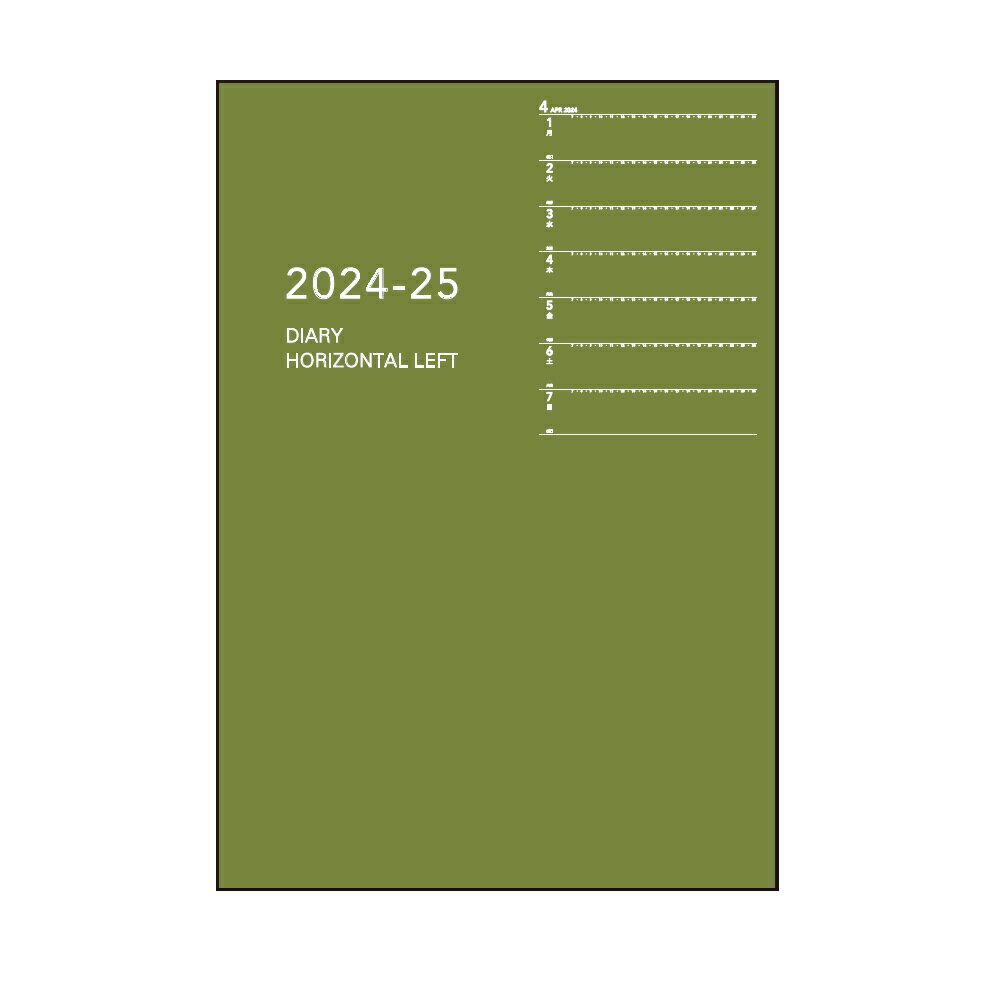 左半分が1週間のスケジュール、右半分が横罫のメモスペースになっており、1週間の予定とメモを見開きで管理できるレイアウトです。週間予定表の各ページには、前月・当月・次月と3ヶ月分のカレンダーが付いています。時間軸付きなので予定を時間で管理したい方にもおすすめです。付録:0●開始月:2024年4月始まり●日付期間(掲載期間):週間:2024年4月〜2025年3月●罫内容:週間●記入欄:1週間+横罫 月曜日始まり●サイズ(判型):B6●寸法:H180xW120x6mm●色:グリーン●表紙:加工紙●中紙:手帳用紙●ページ数:112ページ