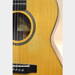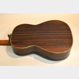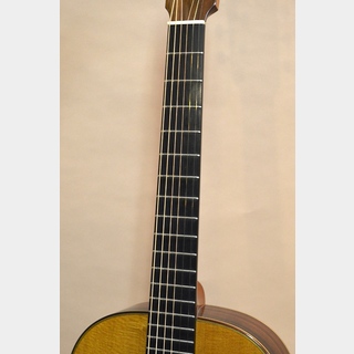 ソリッド・スプルースTOP、ソリッド・インディアン・ローズウッドSIDE&BACK、マホガニーNECK、エボニー指板&ブリッジ、実測46mmナット、632mmスケール、カシュー・フィニッシュのカスタム・モデル。堤氏は通常クラシック・ギターしか製作していませんが、何処かからか頼まれて10本程度のアコギを製作したとの事。こちらはその中の稀少な1本となります。見た目はまんまクラシック・ギターですが、、(笑)、ボディー幅は約366mm程度で、マーチンで言うところの00サイズ、ギブソンで言うところのLGサイズくらいのサイズ感です。ナット幅は約46mmとワイド・ネックで、握りも元々は結構太めだったようですが、前オーナーの方が堤氏に依頼し、ネックをリシェイプしてもらったそうです。現在は気持ち太めのUグリップといった印象になっています。細いネックが好きな方には不向きですが、少し太めのグリップ感がお好みの方なら違和感なく演奏可能かと思います。