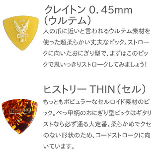 始めたばかりでまだ手の力が抜けてないときにおすすめの柔らかいおにぎりピックから、ある程度慣れてきたときに試してほしい人気のピックまで揃えました。ぜひこのセットを試して自分に馴染むピックを見つけてください!