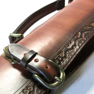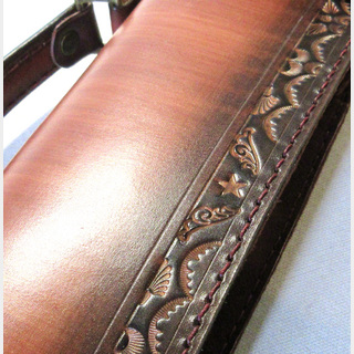 本体の周囲を囲むように彫られた刻印が革独特の重厚感を醸し出します。