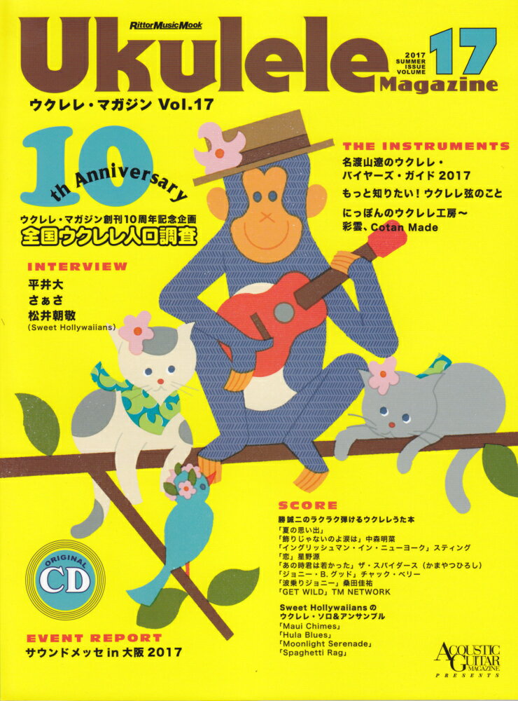1:■[Interview] 2:平井大/さぁさ/松井朝敬(Sweet Hollywaiians) 3:■【Special Contents】 4:創刊10周年記念企画 全国ウクレレ人口調査 <WEB連動> 5:■[The Instruments] 6:名渡山遼の ウクレレ・バイヤーズ・ガイド2017 <WEB連動> 7:にっぽんのウクレレ工房 〜彩雲、Cotan Made 8:もっと知りたい!ウクレレ弦のこと 9:名渡山遼のウクレレ・ラボ〜 第5回 ウィームアップの研究 10:■[Event Report] 11:サウンドメッセ in 大阪 2017 12:THE BEATUS MAGICAL UK TOUR 13:♪【SCORE】 14:●[Sweet Hollywaiiansのウクレレ・ソロ&アンサンブル] <CD連動> 15:Maui Chimes 16:Hula Blues 17:Moonlight Serenade 18:Spaghetti Rag 19:●[勝誠二のラクラク弾けるウクレレうた本] <WEB連動> 20:夏の思い出 21:飾りじゃないのよ涙は 22:イングリッシュマンインニューヨーク 23:恋 24:あの時君は若かった 25:ジョニー B.グッド 26:波乗りジョニー 27:GET WILD