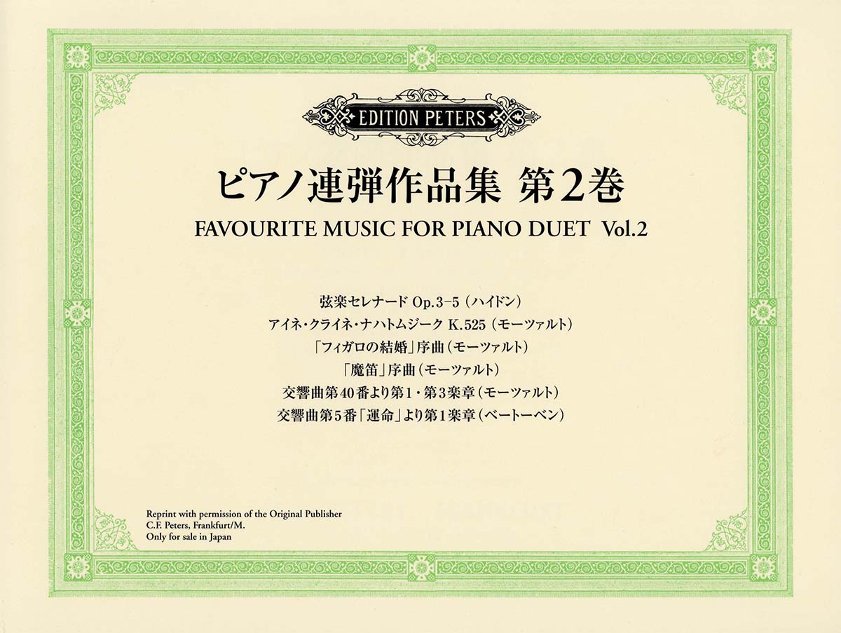 第二巻はハイドン、モーツァルト、ベートーヴェンの作品を取り上げました。ピアノ連弾で奏でる一味違った魅力をお楽しみください。■収載曲 [全7曲を収載][1] 弦楽セレナード Op.3-5Serenade From String Quartet Op.3-5(Arranged by T.A. Johnson)編成: 連弾[2] アイネ・クライ・ネナハトムジーク K.525Eine Kleine Nachtmusik KV.525(Arranged by Otto Singer)編成: 連弾[3] 「フィガロの結婚」序曲Die Hochzeit des Figaro, Ouvert?re(Arranged by Richard Kleinmichel)編成: 連弾[4] 「魔笛」序曲Die Zauberfl?te, Ouvert?re(Arranged by Richard Kleinmichel)編成: 連弾[5] 交響曲第40番より第1楽章Symphony No.40, 1st & 3rd Movements(Arranged by Hugo Ulrich)編成: 連弾[6] 交響曲第40番より第3楽章Symphony No.40, 1st & 3rd Movements(Arranged by Hugo Ulrich)編成: 連弾[7] 交響曲第5番「運命」より第1楽章Symphony No.5, 1st Movement(Arranged by Hugo Ulrich)編成: 連弾