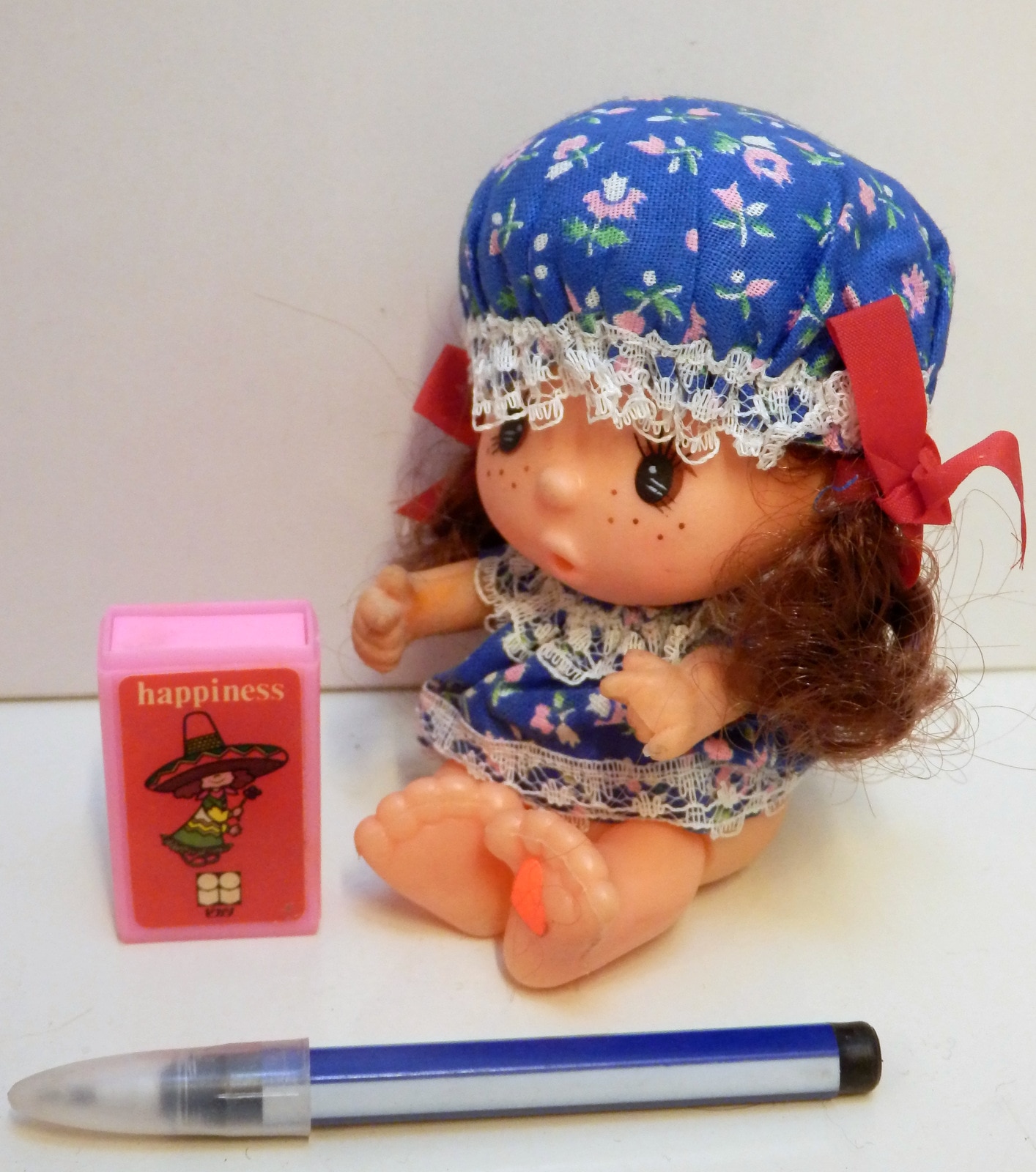 昭和レトロ ソフビ人形 女の子(青) ロケット鉛筆(青)と消しゴム付(黄色)