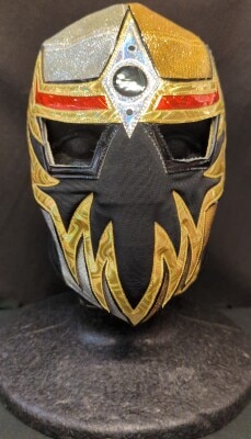 プロレスマスク カレリー製【マスカラ・ドラダ ジョーカーハーフタイプ(金ラメ・白×黒ラメ入り・金フチ)】本人使用 タグなし サイン入り