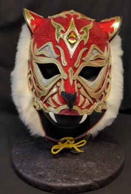 プロレスマスク マニア館製【初代タイガーマスク (金ラメ×黒・赤特殊フチ)】 4代目タイガーマスク サイン入り