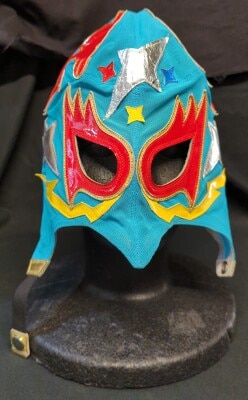 プロレスマスク CACAO製 スペル・デルフィン(金・銀・ヒョウ柄生地×赤・水・黄フチ)タグ付き サイン入り
