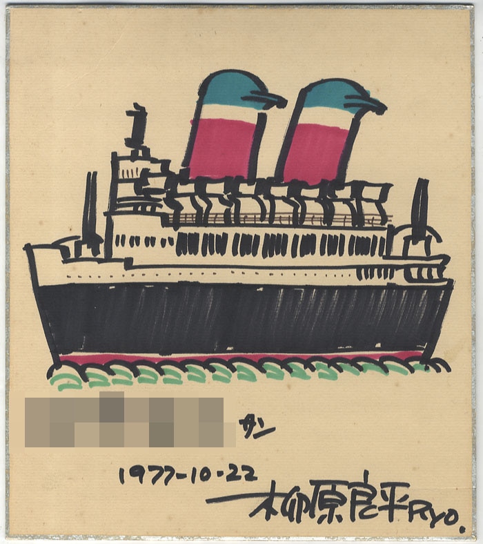 | 宛名あり(画像ではモザイク処理しています)。 裏面イタミほか、全体的にヤケなど経年イタミあり。 色紙額・まんだらけ保証書付き 額イタミあり |