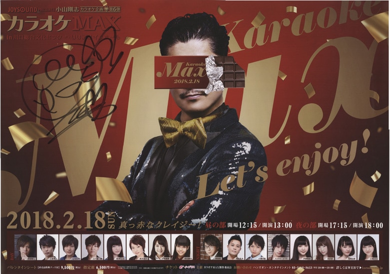 | 2018年2月18日に埼玉県川口総合文化センター リリアで行われた、JOYSOUNDプレゼンツ小山剛志カラオケMAX夜の部で、抽選10名に当選したもの。 ふち小イタミ。丸めて保存。B2サイズ |
