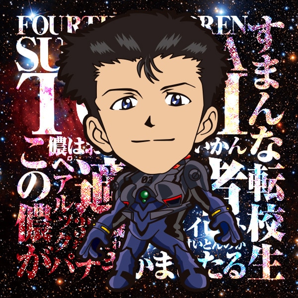| 1995年アニメ『新世紀エヴァンゲリオン』より。フォースチルドレン、鈴原トウジ。プラグスーツバージョン。48mm×48mm。裏書きあり。 |