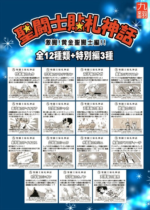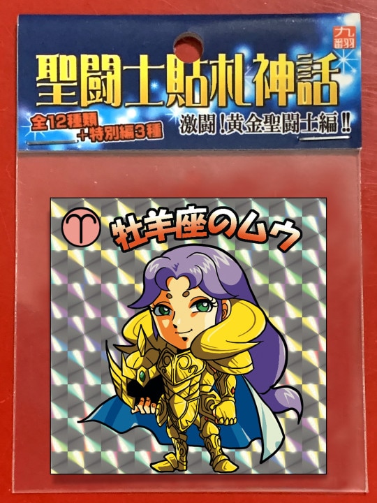 | 聖闘士星矢、黄金聖闘士のマン風シールです。12星座+特別編として牡羊座シオン、天秤座童虎、双子座カノンで全15種類。1部シールで第1版と第2版で印刷違いがありますが在庫をわけてないのでどちらが届くかは選べません。ご了承ください。 サイズ:61mm×85mm。シール本体:48mm×48mm。裏書あり。 |
