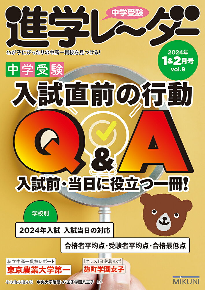 入試直前は、最終的な併願プランの作成から、健康管理、出願などの入試準備、そして実際に入試が始まれば、受験生を入試に連れて行き、入学手続きなど、保護者のやることはたくさんあります。また入試期間中に困ることもさまざまあるかもしれません。今号では、入試直前から入試当日の行動まで、ポイントをQ&A形式でまとめてバッチリ解説!「学校別 2024年入試 入試当日の対応」もとても参考になるデータです。【特集】入試直前の行動 Q&A●日能研の先生に聞く 2024年入試を乗りこえる●入試直前の行動 1受験校、最終決定のポイントは? 2生活面・健康面で大事なことは? 3出願の準備と手続きの流れは? 4試し受験とふり返りとは? 5〜入試1週間前・前日の流れは?●入試当日の行動 1入試当日朝〜午前入試の流れは? 2入試当日 午後入試〜試験終了の流れは? 3合格発表・入学手続きで大事なことは?●[学校別]2024年入試 新型コロナウイルスなど入試当日の対応●[首都圏抜粋]過去3年分(2023年〜2021年) 合格者平均点・受験者平均点・合格最低点【連載】・私立中高一貫校レポート●東京農業大学第一・1クラス1日密着ルポ●麹町学園女子・この授業が受けたい!●中央大学附属・放課後・学校探検!●八王子学園八王子・2024年中学入試トピック《首都圏編》・いまどきの中学・高校受験事情・世界の中で小さな声を聞く・たのしい美術・愉快な英語教育とICT・開成の歴史・調和(アンサンブル)しよう!・受験生の毎日ごはん・素材文で読む中学入試・レッツゴー四字熟GO!・親と子の合格ナビ・日能研の教室から・学校行事スケジュール ほか