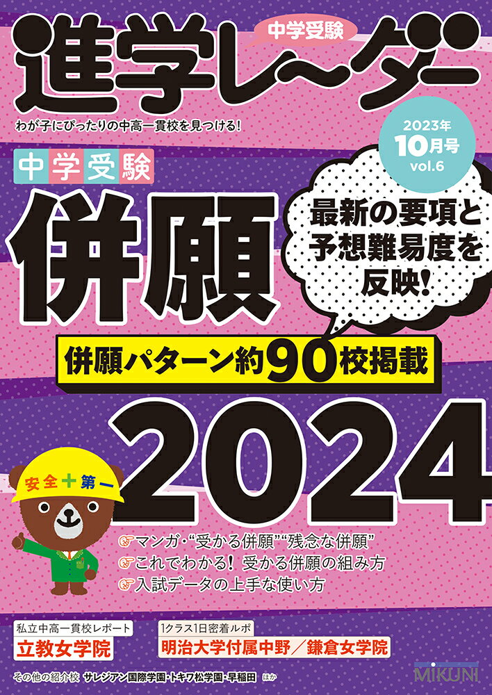 過去問演習も本格的にスタートし、第1志望校以外の受験校も具体的に絞り込んでいく時期となりました。そこで重要なのが併願の組み立てです。チャレンジ校ばかりになっていないか、日程の前半に受けられる安全校は準備できているか、確認しながら受験校を絞り込み、併願を組み立てましょう。今号では学校別の併願パターンを約90校ご紹介。わが家の併願パターン作りにお役立てください。【特集】併願2024●マンガでわかる! “受かる併願”“残念な併願”●比較で解説 受かる併願の組み方・併願基本の3パターン・成績タイプ別 おすすめ併願パターン●受かる併願を組む データの使い方●併願パターンの見方&第1志望校インデックス●併願パターン男子編・難関校・東京 男子校・共学校・神奈川 男子校・共学校・千葉 共学校・埼玉 共学校・大学系・国立・公立●併願パターン女子編・難関校・東京 女子校・共学校・神奈川 女子校・共学校・千葉 女子校・共学校・埼玉 女子校・共学校・大学系・国立・公立【TOPIC】イベントレポート山手女子4校×日能研フェア【連載】・私立中高一貫校レポート●立教女学院・1クラス1日密着ルポ●明治大学付属中野・1クラス1日密着ルポ●鎌倉女学院・この授業が受けたい!●トキワ松学園・放課後・学校探検!●サレジアン国際学園・新校舎へ行ってみた!●早稲田・2024年中学入試トピック《首都圏編》・いまどきの中学・高校受験事情・世界の中で小さな声を聞く・たのしい美術・愉快な英語教育とICT・開成の歴史・調和(アンサンブル)しよう!・受験生の毎日ごはん・素材文で読む中学入試・レッツゴー四字熟GO!・親と子の合格ナビ・日能研の教室から・学校行事スケジュール ほか