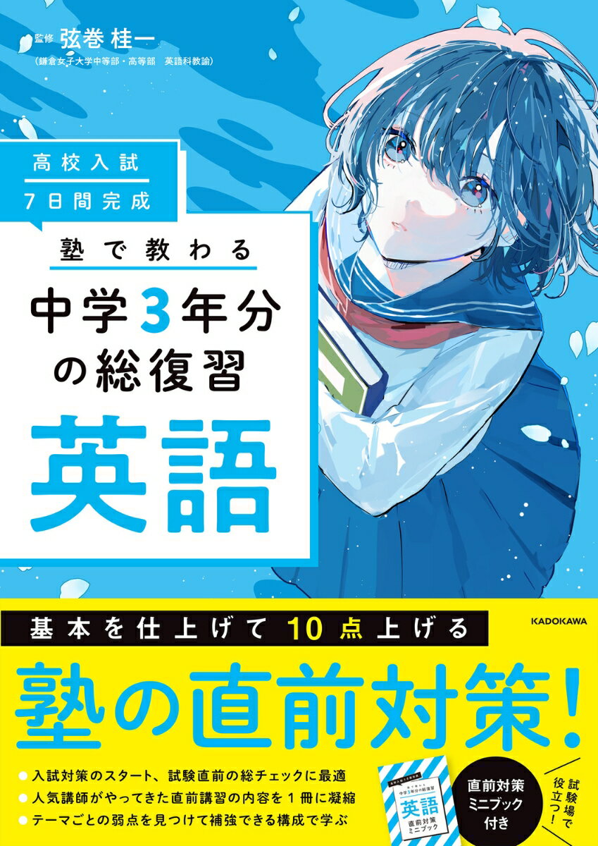 人気講師がやってきた、直前講習の内容を1冊に凝縮!たった1週間で、「5点、10点上がる」「もう1問とれる」「合格が近づく」ような、塾の直前対策メソッドを紙面で再現!中学3年生のための、サクッと超重要事項をおさらいする「書き込み式の要点&問題集」が登場!この1冊で、合格への突破口を開く!■本書の特長【1】高校入試対策に精通した講師陣の監修人気講師がやってきた、塾の直前講習の内容を1冊に凝縮!超重要事項をコンパクトにまとめているので、直前期の仕上げにも、夏休みのおさらいにも、入試対策をスタートしたときの一通りのチェックにも使える。中学3年生の入試対策の最初から最後まで役立つ1冊。【2】たった48pの問題集だから、一気にやりきれるサクッと超重要事項をおさらいする「書き込み式の要点&問題集」になっているから、すぐにやり切れる。ダウンロード特典の解きなおしPDFで何度も取り組める。【3】高校入試の過去問があるから、入試対策に直結する7日間の学習を終えた後の「入試実戦」では、公立高校入試の過去問題を掲載。基本のおさらいのみならず、実戦力も身につく。【4】直前対策ミニブックが試験場でも役立つ直前対策ミニブックにはすぐに得点に結びつく内容を厳選して掲載。試験場に持っていって、最後の最後に「もう1問」とれる。■こういった思いを持つ方に最適おもに公立高校を志望する中学3年生で、・最後の最後に、もう1問もぎとりたい・サクッと重要分野をおさらいしたい・苦手な科目の補強をしたい・何からやればいいかわからない・自信はないけど、負けたくない・とりあえず1週間で10点あげたい・まずは1冊やりきりたい・人気の先生と一緒に学びたい■目次【1】本冊●DAY1be動詞の文・There is(are)〜の文・代名詞●DAY2一般動詞の文(現在・過去・未来)・命令文●DAY3助動詞・いろいろな動詞●DAY4進行形・受け身・現在完了形●DAY5比較の文・接続詞・仮定法・間接疑問●DAY6不定詞・動名詞●DAY7後置修飾・関係代名詞●入試実戦●巻末資料【2】別冊 解答・解説本冊の解答・解説を掲載【3】直前対策ミニブック重要単語30重要熟語など30重要英作文10会話表現45選■目次【1】本冊●DAY1be動詞の文・There is[are]〜.の文・代名詞●DAY2一般動詞の文(現在・過去・未来)・命令文●DAY3助動詞・いろいろな動詞●DAY4進行形・受け身・現在完了形●DAY5比較の文・接続詞・仮定法・間接疑問●DAY6不定詞・動名詞●DAY7後置修飾・関係代名詞●入試実戦●巻末資料【2】別冊 解答・解説本冊の解答・解説を掲載【3】直前対策ミニブック重要単語30重要熟語など30重要英作文10会話表現45選