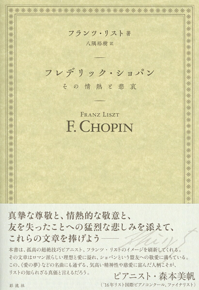 ショパンの芸術と生涯を描いた傑作!世界中の誰もが知る超一流音楽家フレデリック・ショパンの生涯を、その友人にして大音楽家であるフランツ・リストが敬愛をもって書きのこした伝説的名著。72年ぶりの新訳!リスト自筆の雑誌連載記事の付録つき!●フランツ・リストとは?《ラ・カンパネラ》、《愛の夢》など多数の名曲を生み出した大音楽家である。◆本書のポイント・「ピアノの詩人」と評されたショパンの生涯について、彼と生前に切磋琢磨して「ピアノの魔術師」と呼ばれたフランツ・リスト自ら書き下ろした、重要な歴史的資料。・ショパンの死後一年あまりで一気呵成に書き上げられ、ショパンという友への、フランツ・リストの親愛が詰まった名著。・19世紀の音楽界にショパンの評価が定着するきっかけとなった意義深い一冊。◆邦訳版のポイント・原著にはない、フランツ・リスト自身が音楽家の地位などについて語った、当時の『ルヴュ・エ・ガゼット・ミュジカル・ドゥ・パリ』誌の記事を付録として追加。・本文中に登場する場面や事項に関連した図版を独自に追加掲載。・国内では1949年以来、72年ぶりの新訳となる。◆目次『フレデリック・ショパン──その情熱と悲哀』第一章 ショパンの音楽とその様式第二章 ポロネーズ第三章 マズルカ第四章 ショパンの演奏第五章 芸術家の生活第六章 ショパンの生い立ち第七章 サンド夫人第八章 ショパンの最期付録 『ルヴュ・エ・ガゼット・ミュジカル・ドゥ・パリ』の記事より ・音楽家の境遇と社会的身分について ・パガニーニの死について ・ショパンの演奏会第一章 ショパンの音楽とその様式第二章 ポロネーズ第三章 マズルカ第四章 ショパンの演奏第五章 芸術家の生活第六章 ショパンの生い立ち第七章 サンド夫人第八章 ショパンの最期付録 『ルヴュ・エ・ガゼット・ミュジカル・ドゥ・パリ』の記事より ・音楽家の境遇と社会的身分について ・パガニーニの死について ・ショパンの演奏会