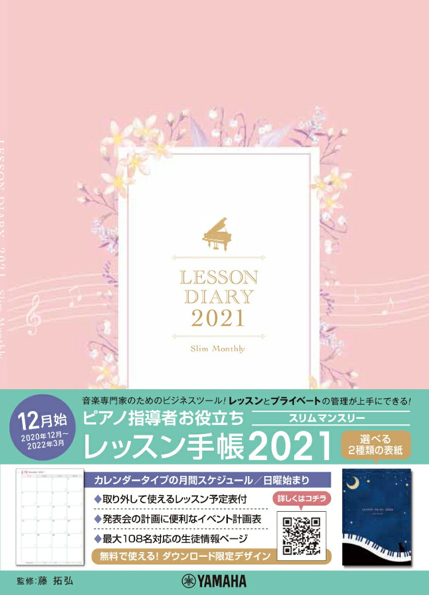 ピアノ指導者へのアンケートをもとに開発した、指導者専用手帳です。スリム(マンスリー)はカレンダータイプのスケジュール管理ページと、ノートとして使えるフリーページが多いのが特徴。手軽に持ち運べる薄さが魅力です。表紙絵柄は選べる2種類。さらにダウンロード限定デザインもあり、気分や季節によって着せ替えができます。取り外して使える「レッスン予定表」のほか、「イベント計画表」「テキスト購入予定表」最大で108人まで管理できる「生徒情報」や「入会問い合わせ」「年齢早見表」など、教室管理に便利な内容になっています。4期がわかる作曲家年表や作曲家の誕生日など、音楽専門家に必要な情報も満載!■2020年12月〜2022年3月対応■日曜始まり■3色ペンが入るペンホルダーと2色のしおり紐付き※法改正にともない祝日・休日が変更になることがあります。(2020年9月現在)
