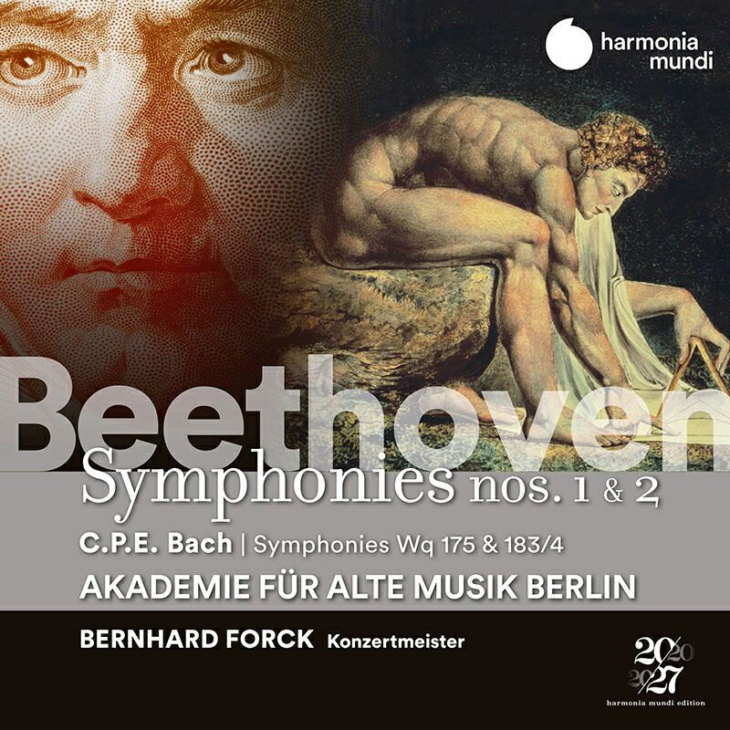 ハルモニアムンディ・ベートーヴェン・イヤー・シリーズ!ベルリン古楽アカデミーによる交響曲第1番&第2番!ハルモニアムンディによるベートーヴェン・イヤー・シリーズ、ベルリン古楽アカデミーによる交響曲第1番&第2番の登場です。『田園』も大好評でしたが、ここでも確かすぎる腕前のメンバーたちがそろってこそ可能となる、洗練されたエネルギーに満ちた演奏です。 第1番は、まるでオペラを思わせる華やかさと繊細さを兼ね備えた演奏。第2番も細部に至るまで完璧なアンサンブル。第3楽章スケルツォのコントラストも実にあざやかです。 カップリングはC.P.E.バッハ[1714-1788]の交響曲2編。ベートーヴェン以前の大シンフォニー作曲家であったC.P.E.バッハの作品ももちろん創意に満ちていますが、こうして並べて聴いてみると、たとえばそれぞれの第1楽章の特徴的な冒頭だけとってみても、ベートーヴェンが先人たちの作品を超えようとして様々なアイデアを凝らしていることにあらためて感じ入るばかりです。30歳ほどのベートーヴェンが描きあげ、満を持して世に送り出した決定打を、ベルリン古楽アカデミーの鮮やかかつ洗練された演奏で思う存分お楽しみいただけます。 この録音に際し、ベルリン古楽アカデミーの面々は、ウィーンでベートーヴェンが演奏したことのある場所(いわゆるホール)すべてを訪ね、その音響を研究。最終的に、小さなホールの響きを理想とし、そのために弦楽器のメンバーも人数を少なくしての編成での録音の運びとなりました。ベートーヴェン自身が指揮をした演奏会の詳細な記録や絵画は残っていませんが、当時の劇場年鑑に残されているオーケストラのメンバーの人数の記録などから当時のオーケストラの陣容を推察。レイアウトについても、弦楽器は観客から見て左側、管楽器は右側になるようにし、コントラバスはトロンボーン、トランペットやティンパニの少し後ろに配置しました。これにより、メンバー間でのコンタクトもとりやすくなり、指揮者無しでもまるで室内楽を演奏しているように各セクションの次の一手を酌むことができたといいます。 ジャケット挿絵:ウィリアム・ブレイク『ニュートン』(1795)(輸入元情報)【収録情報】● C.P.E.バッハ:交響曲(シンフォニア) ヘ長調 Wq.175, H.650 (1755/56)● ベートーヴェン:交響曲第1番ハ長調 op.21 (1799-1800)● C.P.E.バッハ:交響曲ト長調 Wq.183/4, H.666(オーケストラのための4つの交響曲、1776年より) (1775/76)● ベートーヴェン:交響曲第2番ニ長調 op.36 (c.1801-02) ベルリン古楽アカデミー ベルンハルト・フォルク(コンサートマスター) 録音時期:2018年9月 録音場所:テルデックス・スタジオ・ベルリン 録音方式:ステレオ(デジタル/セッション)Powered by HMV
