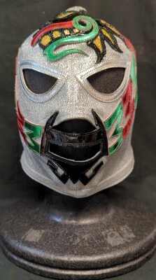プロレスマスク アンヘルアステカ製【ミル・マスカラス(銀ラメ×赤・黒フチ)】タグなし