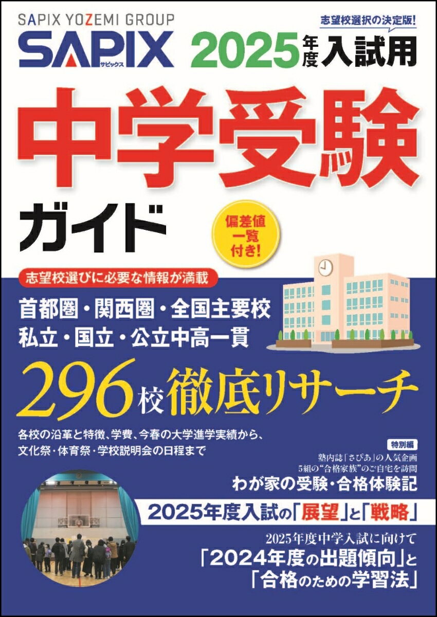 首都圏、関西を中心に、全国の主要校296校の学校情報を収録。教育内容のほか、マネーガイド、進路実績など、志望校選びに役立つ詳細なデータをわかりやすくまとめている。 さらに、SAPIX小学部が最新の入試分析から来年度の動向を予測する「2025年度入試の展望と戦略」、各教科責任者が効果的な学習法をアドバイスする「2024年度の出題傾向と合格のための学習法」のほか、最難関中学に合格した卒業生とその家族に受験生活の様子を語ってもらう「わが家の受験・合格体験記」など、記事ページも充実。中学受験を目指す受験生と保護者いずれにとっても、読み応えのある1冊となっている。 SAPIX小学部オリジナルの偏差値一覧付き。