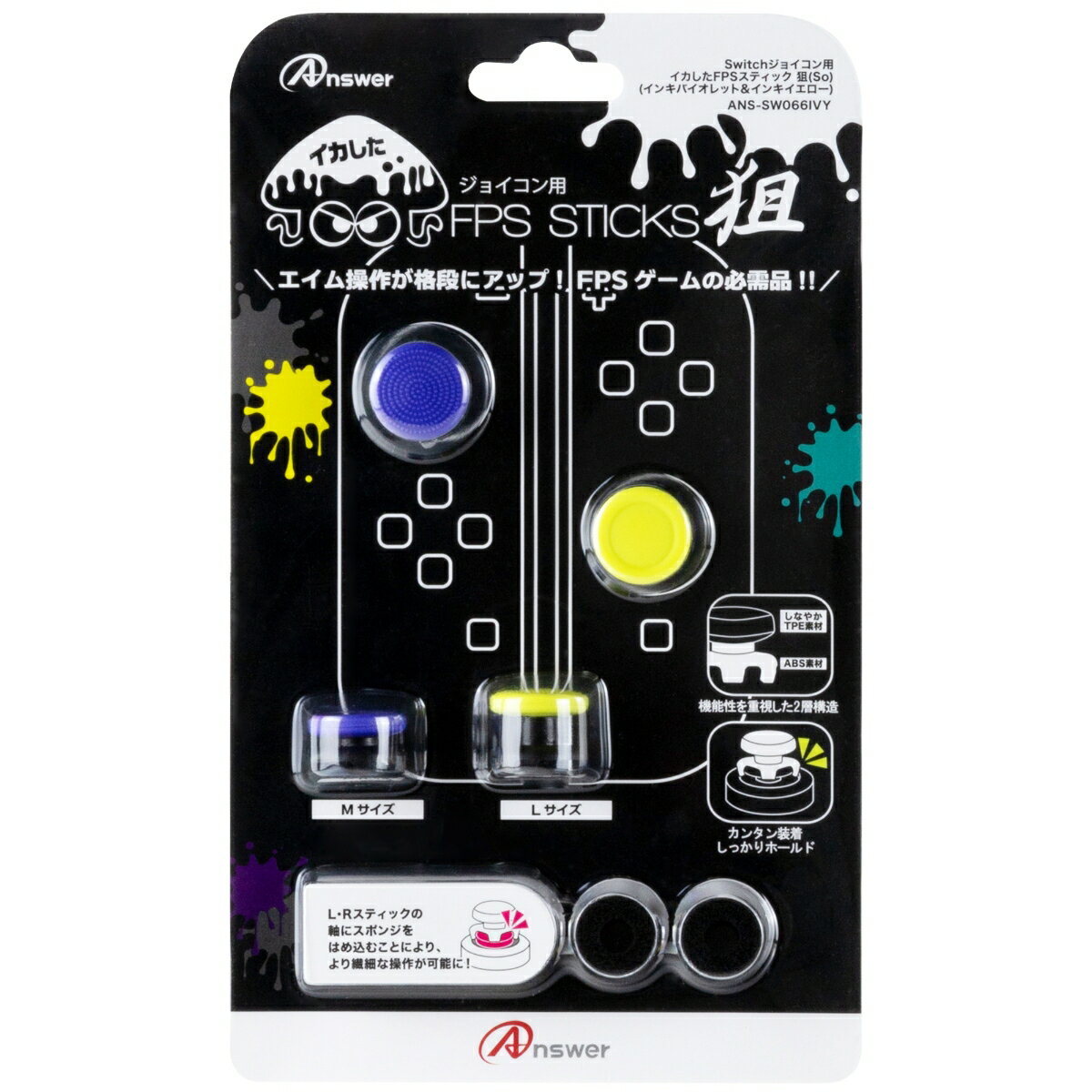 Switchジョイコン用 イカしたFPSスティック 狙ジョイコンのエイム操作が大幅UP!人気シリーズにスプラ3カラーが登場!●スプラ3カラー登場!「ジョイコン用FPSスティック狙」にスプラ3カラーが登場!大人気ソフトをイメージしたカラーでプロコンをカスタマイズ!●FPSゲームに最適!FPSスティックをスティックボタンに装着する事でスティックの位置を高くして操作精度を向上し、エイム操作で格段に狙いやすくなる!Highタイプ(Lサイズ)とLowタイプ(Mサイズ)のFPSステックが各2個同梱。 ●アシストリング(スポンジ)付属で細かな操作も楽々!付属のアシストリングを、スティックボタンの軸にはめ込むことでスティックが固定され、細かな操作が可能となります。激しい操作で、スポンジがすり減った際の交換用としてアシストリング(スポンジ)を10個同梱しています。 ●カンタン装着!FPSスティック・アシストリングは、はめるだけのカンタン装着。※製品の仕様及び外観は予告なく変更する事があります。 本製品はアンサーオリジナル製品であり、ライセンス製品ではありません。