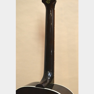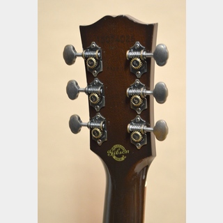 ソリッド・シトカ・スプルースTOP、ソリッド・マホガニーSIDE&BACK、マホガニーNECK、ローズウッド系指板&ブリッジ、ハンド・カーブド・スキャロップ・ブレーシング、実測44mmナット、24.75インチ・スケールの16インチ・ラウンド・ショルダー。ボディー内のオレンジ・ラベルにはJ-45 DELUXEとのモデル名が印字されています。パール・ギブソン・ロゴにコスモ・ブラックのオープン・バック・ギア・チューナー、指板&ブリッジに使われている材も普通のインディアン・ローズウッドでは無く、パーフェローか何かのローズウッド系の木材のように見えます。あとレギュラーのJ-45との違いはカラーリングが赤みの入ったTri-burst系のフィニッシュって所でしょうか?恐らく当時のマンスリー・リミテッド・モデルか、何かのショー・モデルかと思われますが、、まぁルックス的に少し個性があるJ-45って感じです(笑)。