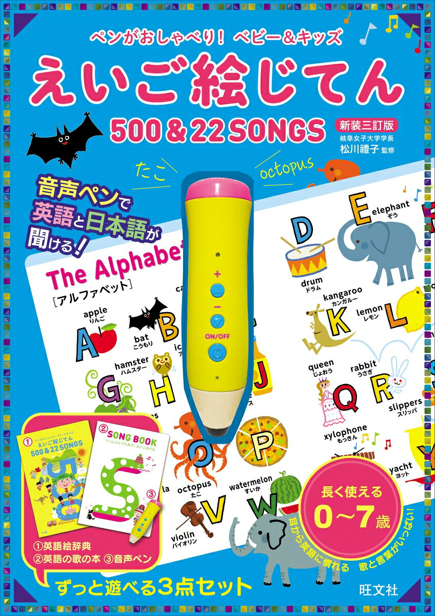 絵をタッチするだけで、「音声ペン」がネイティブの発音で単語やフレーズを教えてくれる「音のでる」英語絵辞典です。0歳から小学校低学年まで、長くお使いいただける内容です。■えいご絵じてん 英語の音とリズムに親しめる歌、くりかえし取り組めるクイズ、あいさつや会話のコーナーもあり、親子で楽しめます。英語だけでなく日本語でも言葉を覚えられるバイリンガル音声は、小さいお子さんにもぴったり。単語は「英検Jr.」や小学校英語にも役立つ500語を厳選し、お子さんの生活や興味の広がりに沿った3つのステージに分けて収録しました。■歌絵本 SONG BOOK 「英語の歌をもっとたくさん聞かせたい!」という声から生まれた歌絵本です。海外の有名な伝統曲や、英語で気持ちを表現できるようになる歌17曲を、音声ペンで聞くことができます。作曲・編曲は、エリック・ジェイコブセンさんが担当。楽しい効果音もたっぷりで、歌いながら自然と英語に親しめます。【主な内容】絵じてんテーマ:32種類歌・チャンツ:5曲会話:3場面クイズ:2種類SONG BOOK歌:17曲本書専用の音声再生機器「音声ペン」と単4電池2本が付属します。この商品は『ペンがおしゃべり! ベビー&キッズ えいご絵じてん 500&22 SONGS 三訂版』のスリーブデザインを変更した新装版です。旧版との内容の変更はございません。購入の際はご注意ください。■「絵じてん」目次STAGE 1The Alphabet:アルファベットNumbers:数歌:Old MacDonald Had a Farm歌:Five Little MonkeysAnimals:動物の名前歌:Head, Shoulders, Knees and ToesMy Body:体の各部の名前 ほかSTAGE 2Colors and Shapes:色・形の名前My Room:部屋の中にある物の名前My House:家全体Clothes:衣服や身につける物の名前Big and Small, Long and Short:大小・長短 ほかSTAGE 3Classroom:教室にある物の名前My School:学校にある物の名前Sports:スポーツMusic:音楽Seasonal Events:行事の名前Jobs:職業の名前 ほか■「SONG BOOK」目次♪THE ALPHABET SONG♪THE WHEELS ON THE BUS♪FRIENDS♪JINGLE BELLS♪TWINKLE TWINKLE LITTLE STAR♪IF YOU'RE HAPPY ほか 全17曲