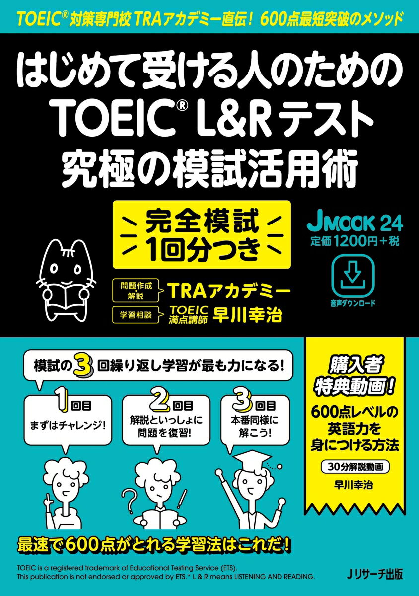 【特長】・「模試を3回解いて最短距離で600点を取る」ことをめざしたムック! 模試学習の効率を最大限に高める工夫が満載!・フルサイズ1回分の模試を3回解くことで、7日間なのに実力がみるみる身につく!・初級者が600点取得に必要な問題に絞って攻略法を学ぶことができるので、最短・最大効率で600点が取れる!・模試を解いたあとに自分の実力を試せる「全パート問題ドリル」も収録! 新しい問題で実力試しもできる!・TOEIC満点講師早川幸治が「学習相談Q&A」で600点取得に必要な英語力の伸ばし方を解説! 30分の動画付きなので、本と動画で英語の勉強法も学べる「模試を3回解いて最短で600点を突破する」ことをコンセプトとした、TOEIC L&R テスト初心者向けの模試学習ムックです。完全模試・解答解説1回分付。フルサイズ1回分の模試を3回解くことで、試験への慣れ・解法テクニックの定着化・弱点強化といった模試学習のメリットを劇的に高めることができます。模試学習の進め方から、600点取得のために必要な全パートの攻略法まで、わかりやすく丁寧に解説しているので、はじめてTOEICの試験を解く人でも安心して学習を進めることができます。特集1では攻略法を学びながら模試を3回解いていくことで、全パートの解法を知るだけではなく、テクニックの定着化や弱点強化も行うことができます。攻略法のポイントを学ぶページでは、600点取得のために正答しなくてはいけない問題に絞って、わかりやすく端的に解説を行うので、1週間という短期間での大幅なスコアUPに結びつけることが可能となります。また、模試の問題とは異なる全パートの問題がドリルとして収録されているので、模試を3回解いたあとに新しい問題で実力を試すこともできます。特集2ではTOEIC受験者の多くがもっている英語学習に関する悩みを取り上げ、TOEIC満点講師の早川幸治がその悩みに答える「英語学習相談Q&A10選」を収録。試験対策とは別に、一般的な英語力を伸ばすための方法を学ぶことができます。また、購入者特典として、TOEICで600点取得に必要な英語力を身につける学習法について早川幸治が解説している「30分でわかる!600点を最短で取るための英語学習法動画講座」付。TOEIC L&R TEST600点を目指す学習者はもちろん、テストを直前に控えていてまだ対策をしていない人、はじめてのTOEIC受験者にも最適の1冊です。【音声DL内容】・模試/特集1のリスニングパート・全パート問題ドリルのリスニングパート