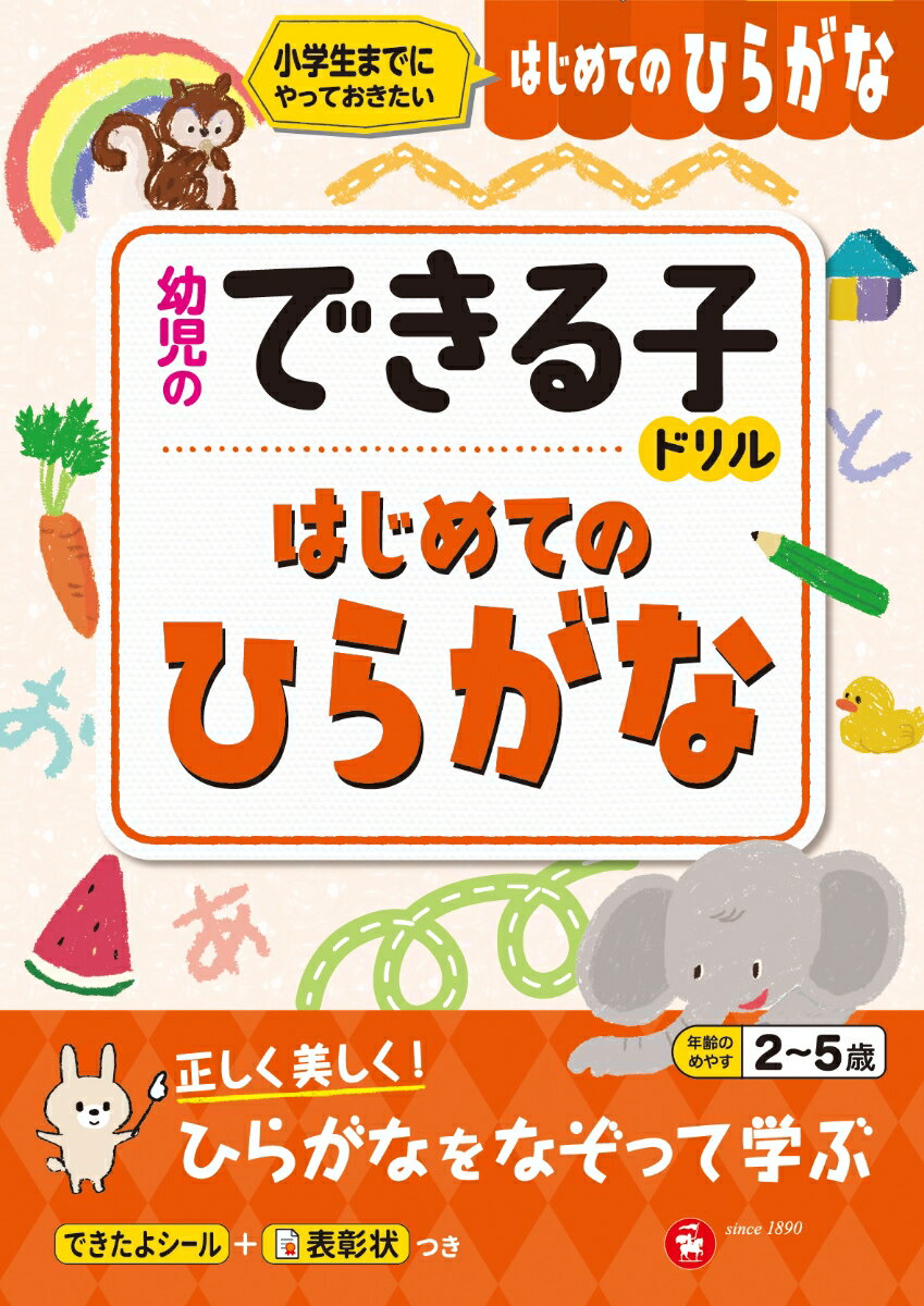 ・まずはじめに,「ひらがなひょう」で全てのひらがなを紹介しています。・鉛筆を使い慣れる練習から取り組みます。書くときの正しい鉛筆の持ち方は裏表紙の裏にあります。・ひらがなを練習するはじめの一歩です。なぞる練習を中心に,ひらがなが楽しく身につくように工夫しています。・最初は,直線,曲線をなぞることから始まります。・ひらがなのページでは,声に出して読む,ゆびや鉛筆でなぞる練習ができます。・ひとつひとつのひらがなについて,一画一画書き方をていねいに示しているので,きちんとした文字が書けるようになります。・「できるかな」のページでは,楽しいクイズやしりとり,迷路などに挑戦しながら,ひらがなを学習することができます。・1枚ずつはがしてプリントのように使うこともできます。・上手にできたら「できたよシール」を貼ってあげます。1冊が終わって全体が上手にできたら「表彰状」をあげて下さい。