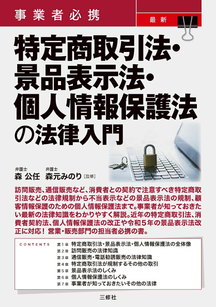 訪問販売、通信販売など、消費者との契約で注意すべき特定商取引法などの法律規制から不当表示などの景品表示法の規制、顧客情報保護のための個人情報保護法まで。事業者が知っておきたい最新の法律知識をわかりやすく解説。近年の特定商取引法、消費者契約法、個人情報保護法の改正や令和5年の景品表示法改正に対応! 営業・販売部門の担当者必携の書。第1章 特定商取引法・景品表示法・個人情報保護法の全体像第2章 訪問販売の法律知識第3章 通信販売・電話勧誘販売の法律知識第4章 特定商取引法が規制するその他の取引第5章 景品表示法のしくみ第6章 個人情報保護法のしくみ第7章 事業者が知っておきたいその他の法律第1章 特定商取引法・景品表示法・個人情報保護法の全体像第2章 訪問販売の法律知識第3章 通信販売・電話勧誘販売の法律知識第4章 特定商取引法が規制するその他の取引第5章 景品表示法のしくみ第6章 個人情報保護法のしくみ第7章 事業者が知っておきたいその他の法律