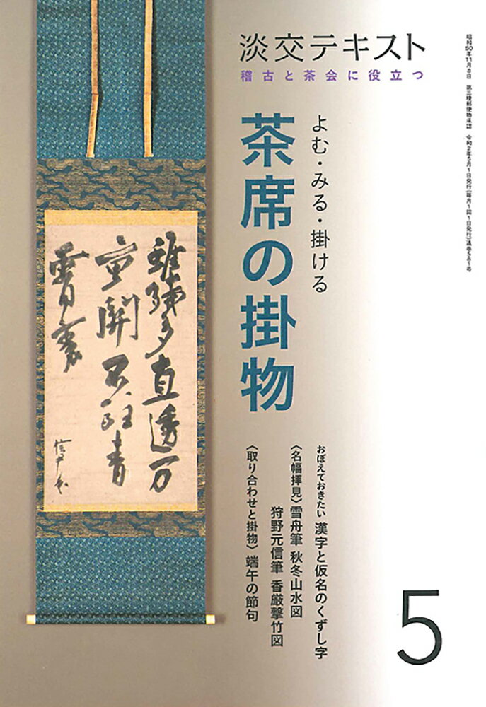 〈掛物を楽しむために知っておきたい、道・学・実の要点〉〈毎月少しずつ、楽しく「くずし字」に親しもう!〉2020年の淡交テキストは「茶席の掛物」をテーマに、毎月1冊を刊行します。掛物をよんでみよう(茶道資料館顧問・筒井紘一氏/茶道資料館学芸課長・橘 倫子氏)では、毎月8幅の掛物を紹介。今月の漢字のくずし字は「竹・雨・関・清」、仮名は「な行」/名幅拝見ー鑑賞の心得(茶道研究家・小田達也氏):「古筆」(懐紙を鑑賞する際の心得について、Q&Aをまじえながらわかりやすく解説した上で、二幅の名幅を誌上でゆったりと鑑賞します。)/取り合わせと掛物(高木宗郁氏):「端午の節句」(掛物と取り合わせに寄せる亭主の思いを語るリレー連載。待合掛と本席掛のバランス、床の間との釣り合いなども紹介します)。巻末には銘の参考になる「季節のことば、禅のことば」も付し、5月の稽古と茶会に役立つ充実の一冊をお届けします。