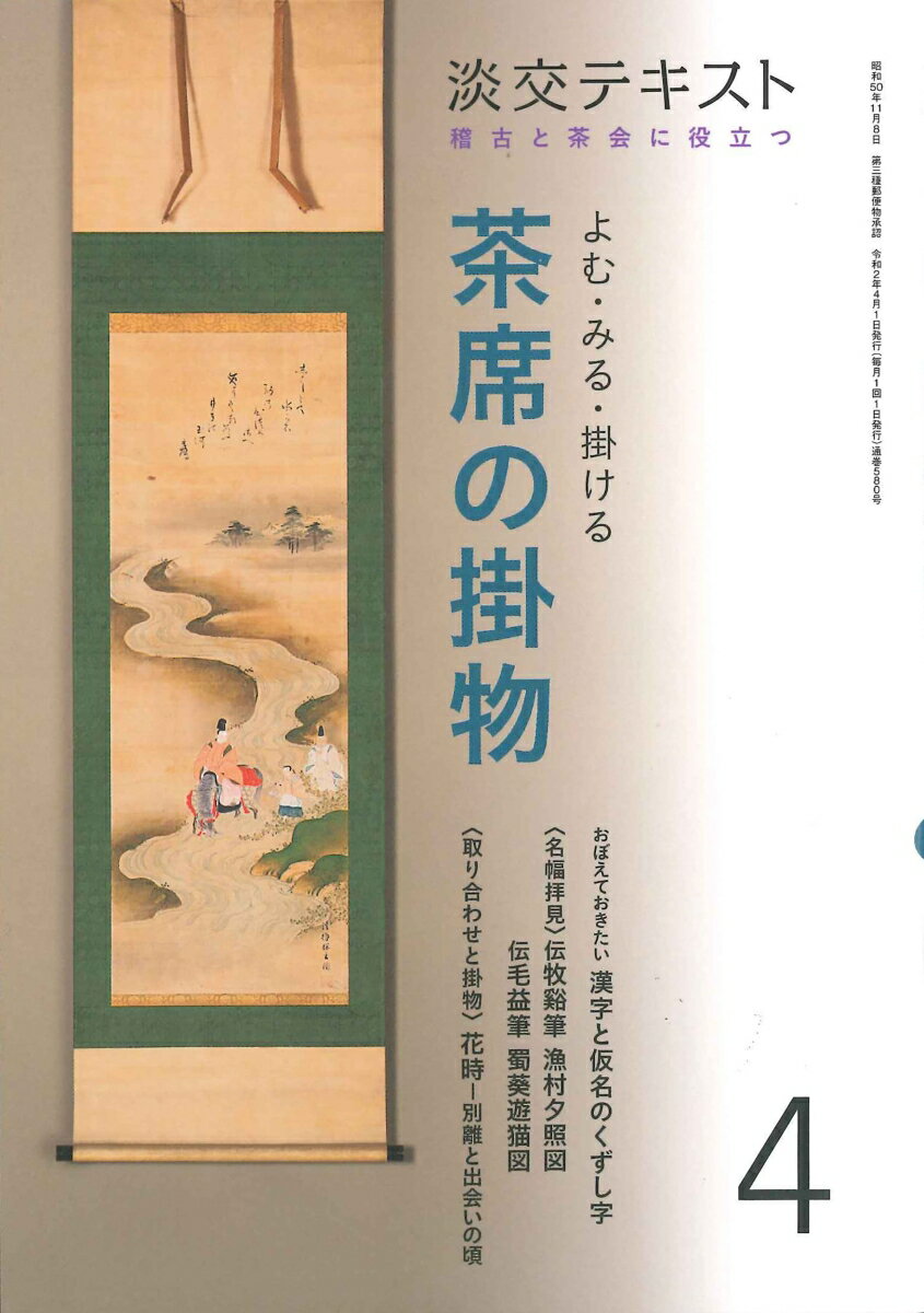 〈掛物を楽しむために知っておきたい、道・学・実の要点〉〈毎月少しずつ、楽しく「くずし字」に親しもう!〉2020年の淡交テキストは「茶席の掛物」をテーマに、毎月1冊を刊行します。掛物をよんでみよう(茶道資料館顧問・筒井紘一氏/茶道資料館学芸課長・橘 倫子氏)では、毎月8幅の掛物を紹介。今月の漢字のくずし字は「寿・満・草・落」、仮名は「た行」/名幅拝見──鑑賞の心得(茶道研究家・小田達也氏):「懐紙」(懐紙を鑑賞する際の心得について、Q&Aをまじえながらわかりやすく解説した上で、二幅の名幅を誌上でゆったりと鑑賞します。)/取り合わせと掛物(菱田宗義氏):「花祭」(掛物と取り合わせに寄せる亭主の思いを語るリレー連載。待合掛と本席掛のバランス、床の間との釣り合いなども紹介します)。巻末には銘の参考になる「季節のことば、禅のことば」も付し、4月の稽古と茶会に役立つ充実の一冊をお届けします。