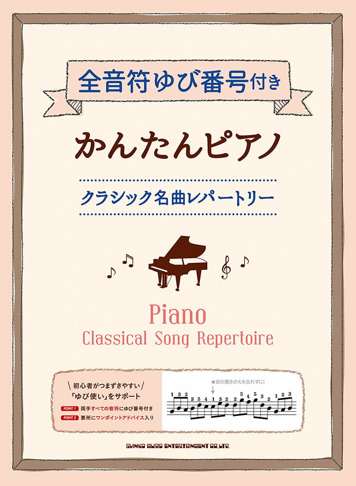 1:■楽譜の基礎知識 2:■指づかいについて 3:カノン 4:春〜「四季」より 5:ハレルヤコーラス(ハレルヤ・コーラス)〜オラトリオ「メサイア」より 6:メヌエット 7:主よ、人の望みの喜びよ 8:G線上のアリア 9:アヴェマリア(アヴェ・マリア) 10:ハイドンのセレナーデ 11:きらきら星変奏曲 12:「アイネクライネナハトムジーク(アイネ・クライネ・ナハトムジーク)」より第1楽章 13:トルコ行進曲 14:トルコ行進曲 15:よろこびの歌〜交響曲第9番より第4楽章 16:エリーゼのために 17:悲愴ソナタ 第2楽章 18:ます 19:別れの曲 20:ノクターン第2番 21:バラード第1番 22:小犬のワルツ 23:愛の夢第3番 24:ラカンパネラ(ラ・カンパネラ) 25:トロイメライ 26:結婚行進曲 27:ハバネラ〜歌劇「カルメン」より 28:ラデツキー行進曲 29:美しく青きドナウ 30:スケーターズワルツ(スケーターズ・ワルツ) 31:凱旋行進曲〜歌劇「アイーダ」より 32:乾杯の歌〜歌劇「椿姫」より 33:ハンガリー舞曲第5番 34:ワルツ第15番 35:情景〜バレエ「白鳥の湖」より 36:花のワルツ〜バレエ「くるみ割り人形」より 37:「展覧会の絵」よりプロムナード 38:ユモレスク 39:家路〜交響曲第9番より第2楽章 40:朝〜「ペールギュント(ペール・ギュント)」より 41:白鳥〜「動物の謝肉祭」より 42:シシリエンヌ 43:ボレロ 44:誰も寝てはならぬ〜歌劇「トゥーランドット」より 45:亜麻色の髪の乙女 46:ジムノペディ第1番 47:ジュトゥヴ(ジュ・トゥ・ヴ) 48:愛の挨拶 49:威風堂々 50:木星〜「惑星」より 51:エンターテイナー 52:ラプソディインブルー(ラプソディ・イン・ブルー)