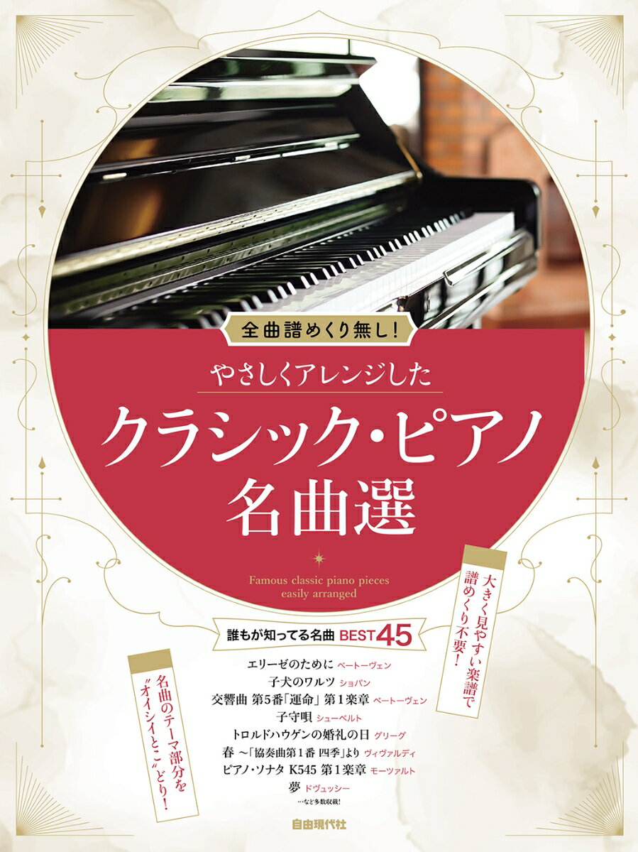 定番のクラシック名曲の有名なテーマ部分を抜粋し『超』やさしくアレンジしたピアノ・ソロ曲集。全曲見開き2ページの掲載で、譜めくりが一切不要!音符も大きく見やすいので、子どもから年輩層まで幅広い世代で楽しめる。【コンテンツ】愛のあいさつ/エルガー愛の讃歌/マルグリット・モノーアヴェ・マリア/バッハ&グノーアラベスク第1 番 〜「2 つのアラベスク」より/ドヴュッシーアリオーソ/バッハイージー・ウィナーズ/スコット・ジョプリン威風堂々/エルガーエリーゼのために/ベートーヴェン乙女の祈り/バダジェフスカカヴァレリア・ルスティカーナ/ピエトロ・マスカーニ鐘/ラフマニノフカノン/パッフェルベル剣士の入場 不チーク子犬のワルツ/ショパン交響曲 第5番「運命」 第1 楽章/ベートーヴェン交響曲 40 番ト短調 第1 楽章/モーツァルト子守唄 シューベルトゴリウォーグのケークウォーク/ドヴュッシーG 線上のアリア/バッハシェラザードより「王子と王女」/リムスキー・コルサコフシシリエンヌ/フォーレ主よ、人の望みの喜びよ/バッハsky high/ラフマニノフダッタン人の踊り/ボロディン調子の良い鍛冶屋/ヘンデル月の光/ドヴュッシー闘牛士の歌 ビゼートルコ行進曲 モーツァルトトロルドハウゲンの婚礼の日/グリーグ人形の夢と目覚め/エステン白鳥/サン・サーンス花のワルツ 〜バレエ「くるみ割り人形」より/チャイコフスキー春 〜「協奏曲第1 番 四季」より/ヴィヴァルディピアノ・ソナタK545 第1楽章/モーツァルト悲愴/ベートーヴェンフランスの古い歌/チャイコフスキープロムナード 〜「展覧会の絵」より/ムソルグスキーボッケリーニのメヌエット/ボッケリーニ目覚まし時計/クープラン夢/ドヴュッシーユーモレスク/ドヴォルザークよろこびのうた/ベートーヴェンラ・カンパネラ/リスト忘れな草 リヒナー私を泣かせてください/ヘンデル