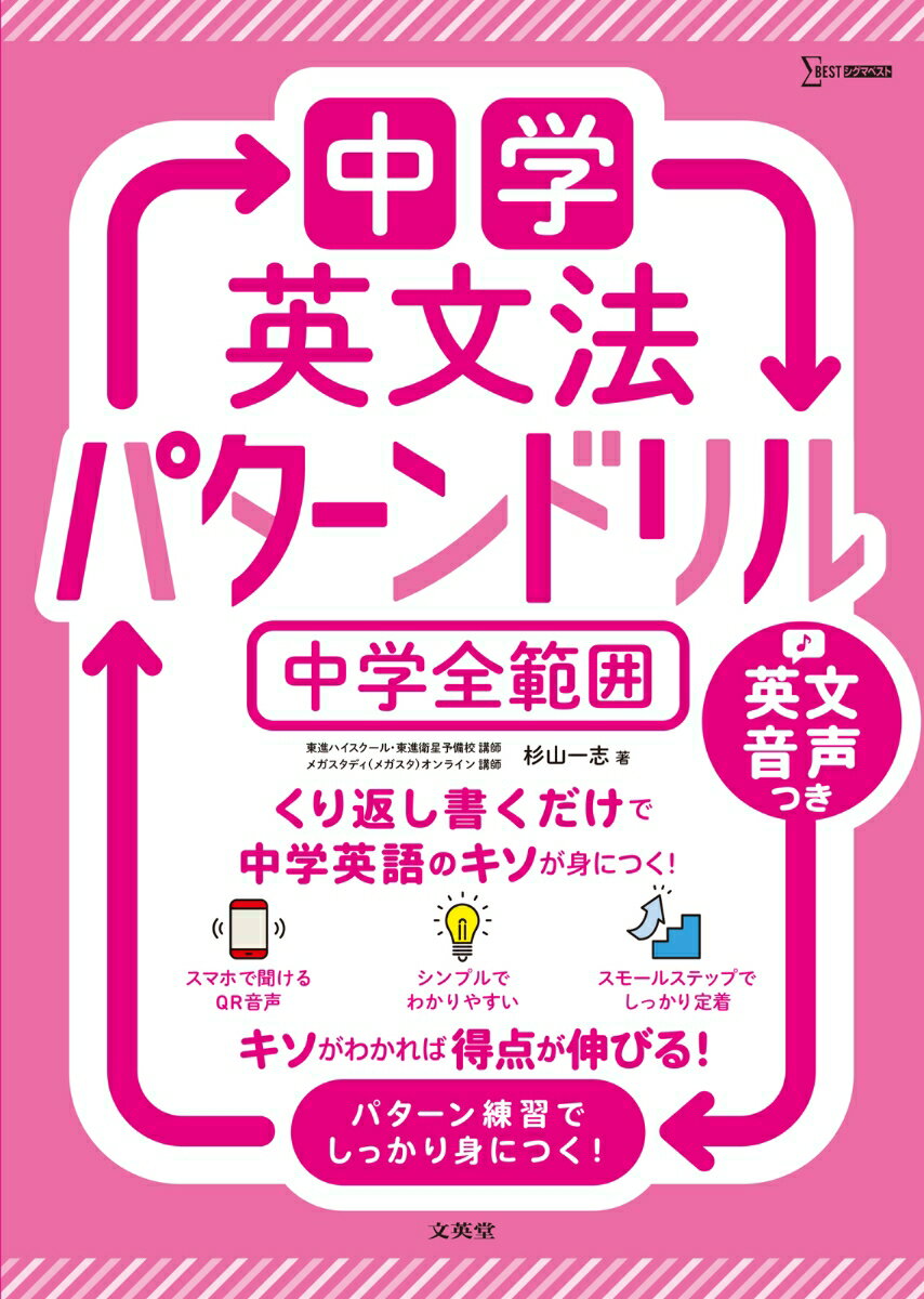 音声再生に対応してさらにパワーアップ!パターン&反復練習で英文法がしっかり身につく!キソがわかれば得点が伸びる!英語に苦手意識がある人や、基礎固め・復習に取り組みたい人にオススメのシリーズです。【特長1】中学全範囲の英文法がこれ1冊で!中学3年間で習う英文法を1冊にぎゅぎゅっと凝縮!学び直しや復習に最適です。【特長2】くり返し書くだけで覚える!Q1:選択問題 → Q2:並べかえ問題 → Q3:英作文問題 とくり返し練習しているうちに、英文法が自然と身につきます。【特長3】スモールステップで基礎をしっかり定着!中学3年間で習う英文法を100セクションに細かくわけているので、基礎からじっくり取り組めます。【特長4】1セクション2ページ構成なので手軽にサクサク取り組める!1回2ページなので、英語が苦手な人でも無理なく自分のペースで進めることができます。【特長5】QRコードで手軽に音声再生!紙面上のQRコードを読み取ることで、スマートフォンやタブレットで英文と日本語訳の音声を手軽に再生できます。また、音声は無料リスニングアプリからもダウンロードいただけます。英文を聴いて、実際に書くことで学習効果がさらに高まります。