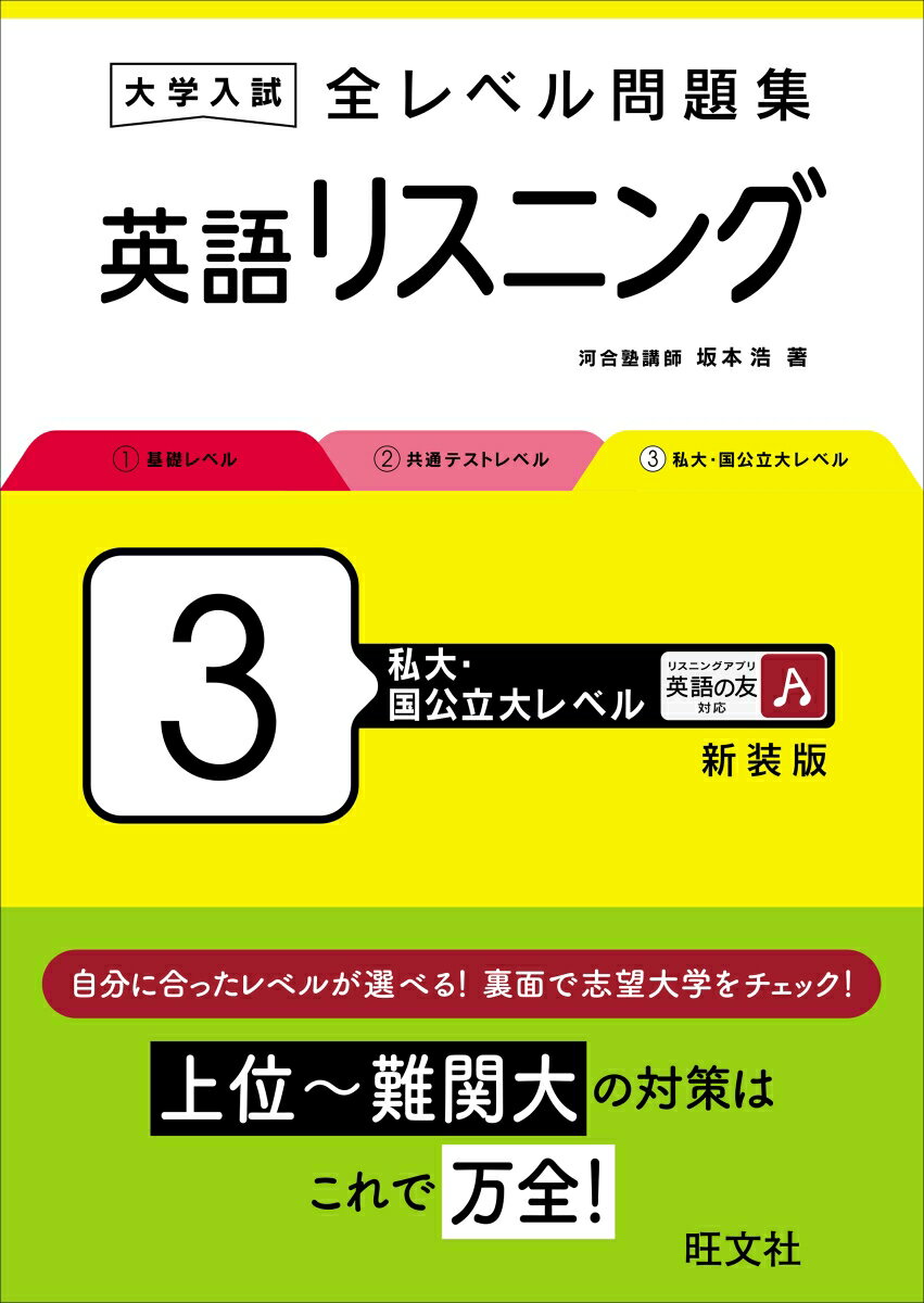 上位・難関大の対策はこれで万全!◆特長◆・レベルに合った、さまざまなタイプのリスニング問題を演習できる!・丁寧な解説だから「音声の聞き方」と「問題の解き方」がよくわかる!・コラム「志望大学別出題分析と学習アドバイス」で志望校の出題傾向がわかる!・音声はアプリや二次元コードで手軽に聞ける!・復習用の音声と巻末スクリプトで、効率的に音読やディクテーションのトレーニングができる!◆自分に合ったレベルが選べる!◆1 基礎レベル2 共通テストレベル3 私大・国公立大レベル※本書の音声は、公式アプリ「英語の友」でもお聞きいただけます。詳しくは、公式サイト(https://eigonotomo.com/)をご覧ください。この商品は『大学入試 全レベル問題集 英語リスニング 3 私大・国公立大レベル』のカバーを変更したもので、収録問題は同じです。購入の際はご注意ください。【コラム】志望大学別出題分析と学習アドバイス第1章 短いダイアローグ第2章 短いモノローグ第3章 長いダイアローグ第4章 長いモノローグ第5章 複合問題【巻末付録】音読・ディクテーショントレーニング