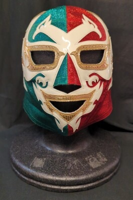 プロレスマスク フラマ製【ドス・カラス(赤ラメ・黒ラメ・緑ラメ・金ラメ×赤・金フチ)】 タグなし 本人使用 サイン入り 着用写真付き